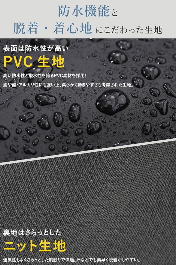 ✅【防水性と着心地にこだわった生地】 表地はカラーブラックのPVC・裏地はニット生地を使用しており防水性とともに中の湿気を排出可能な機能性素材。表地は高い耐水性・撥水性と油や酸・アルカリにも強く防寒性もあり、柔らかく動きやすさも考慮された生地。裏地のニット生地は蒸れにくく、さらっとした肌触りで素早く脱着が可能。