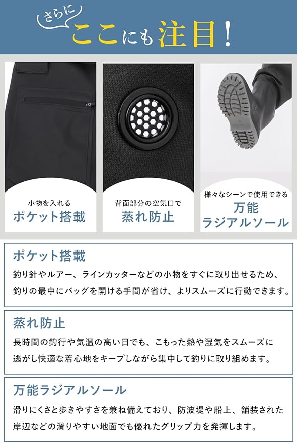 ✅【動きやすく使いやすいラジアルソール】短めのブーツで動きやすく脱着もしやすい!ブーツの継ぎ目は高温圧着密封することにより効果的な浸水防止に努めました。汎用性の高いラジアルソールで様々な場面でご使用いただけます。厚手の靴下や厚着でも対応できるようゆったりサイズにしております。※ウエスト回りは余裕を持たせておりますので、ベルトなどで調整お願いいたします。