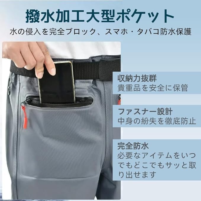 【多用途実用デザイン】チャック付き防水ポケットでスマホ・工具を安全収納。携帯品や工具を濡らさず収納可能。釣りはもちろん、防災・除雪・田植え作業まで幅広いシーンで活躍。