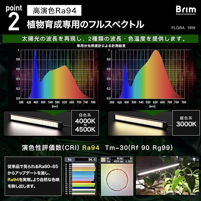 【植物育成専用のフルスペクトル】太陽光の波長を再現し、植物の成長に欠かせない波長を2種類の色温度(4000K-4500K、3000K)で提供します。また、演色性も向上し、従来品で見られるRa80~85からアップデートを施し、Ra94を実現。より自然な色味を映し出します。