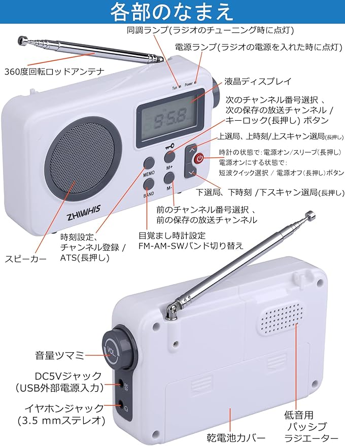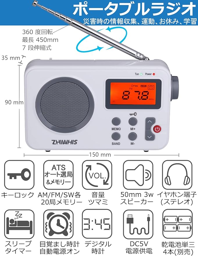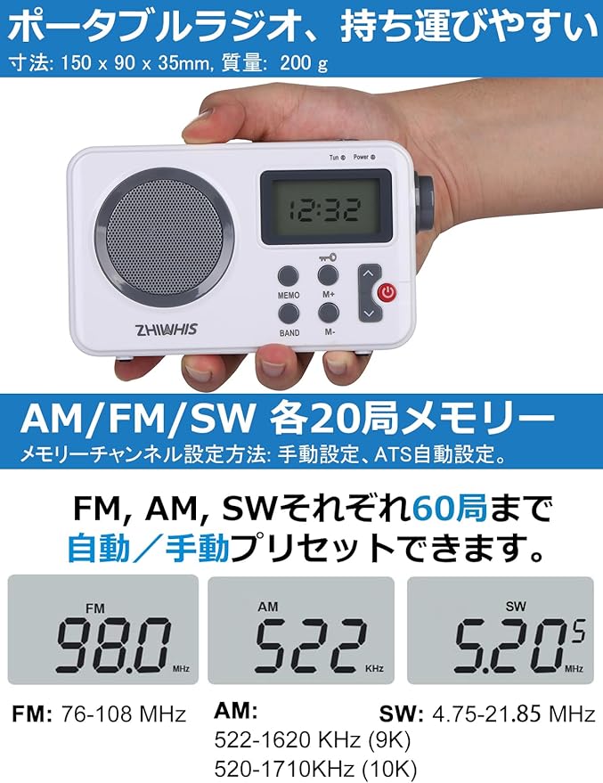 ZHIWHIS 小型ラジオ 携帯 高感度 FM/AM/短波/ワイドFM対応 乾電池式/usb電源使用可能 タイマー/デジタル時計/目覚まし時計/自動電源オン/キーロック/プリセット機能付き 音量ツマミ 防災 ZWS-8801
