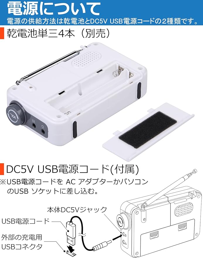 付属コンポーネント 1 x FM/AM/SW ポータブルラジオ本体, 1 x USB電源ケーブル(長さ100センチ), 1 x 日本語取り扱い説明書&保証書