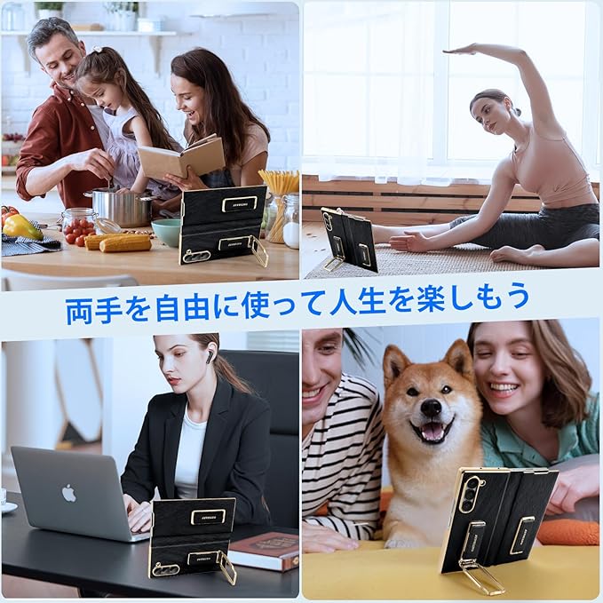 NIFBANG Samsung Galaxy Z Fold 7用のケース レザー フィンガーホルダー付き ギャラクシー z fold 7用のフリップケース スマホベルト付き 金属/メタル スタンド 薄型ギャラクシー Z Fold 7用のカバー 指紋防止 擦り傷防止 耐衝撃 米軍規格 縦横両対応 落下防止 レンズ/カメラ保護 ブディスプレイ側もしっかり保護 ジェットブラック