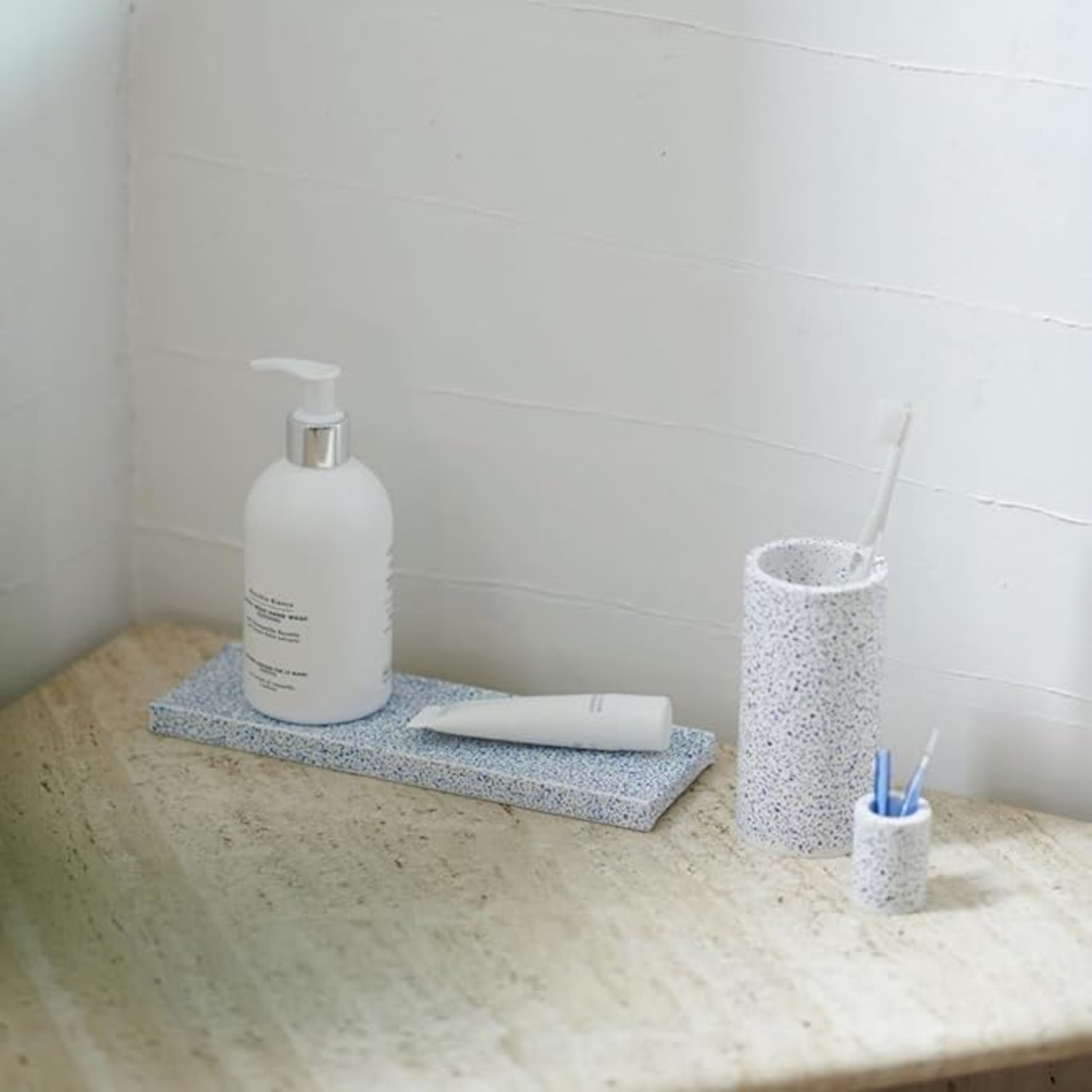 廃棄されるガラス瓶を粉砕し、美しいテクスチュアまで仕上げたディスペンサートレイ