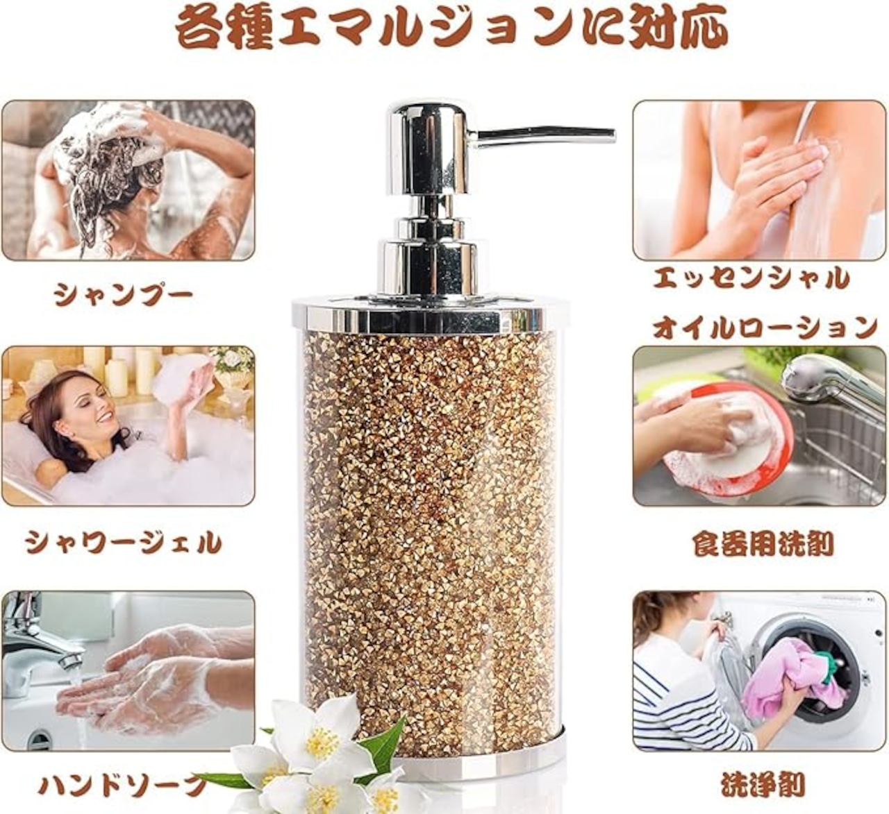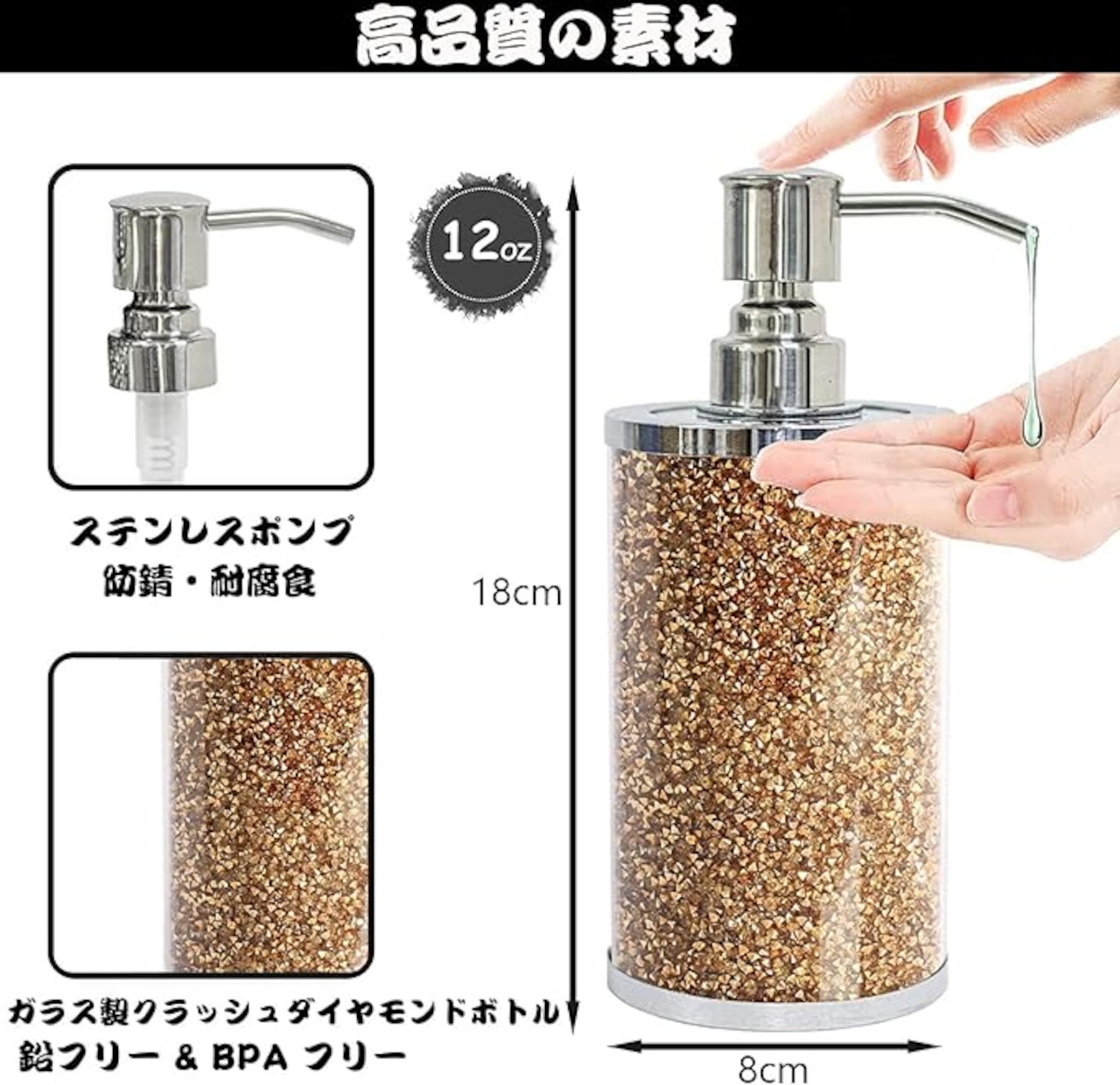 【多用途】ガラスソープディスペンサーは、洗濯室、またはシンクの隣で使用できます。液体石鹸、食器用洗剤、ローション、エッセンシャルオイル、シャンプー、ボディウォッシュ、マウスウォッシュなどに最適です。 クリスタルが輝くハイエンドファッションは、アートと人生の完璧な組み合わせです。