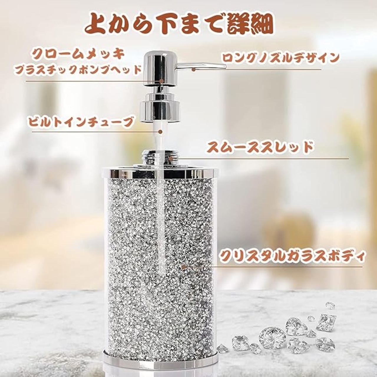【ユニークなデザイン】 ボトル本体にはクラッシュクリスタルダイヤモンドがたくさんあり、シンプルでエレガントなデザインが浴室をよりエレガントで高貴に見せます。 このクリスタルガラス製ソープディスペンサーは、一日中浴室を輝かせます。 結婚式やパーティーなどのプレゼントにも最適です。