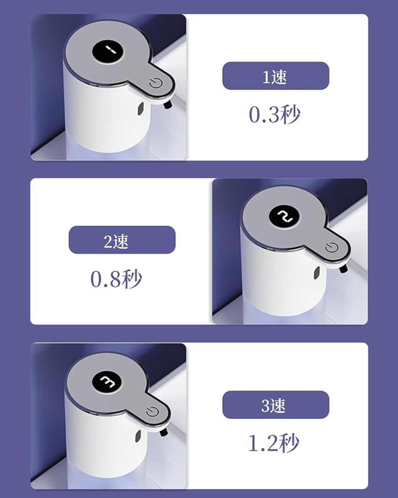 「6 レベル調整、除菌をさらに徹底」オートソープディスペンサーなら、自分に合った量を簡単に選べます。ボタンを押して档位を切り替えるだけで、手をかざすとすぐに吐出されます。
