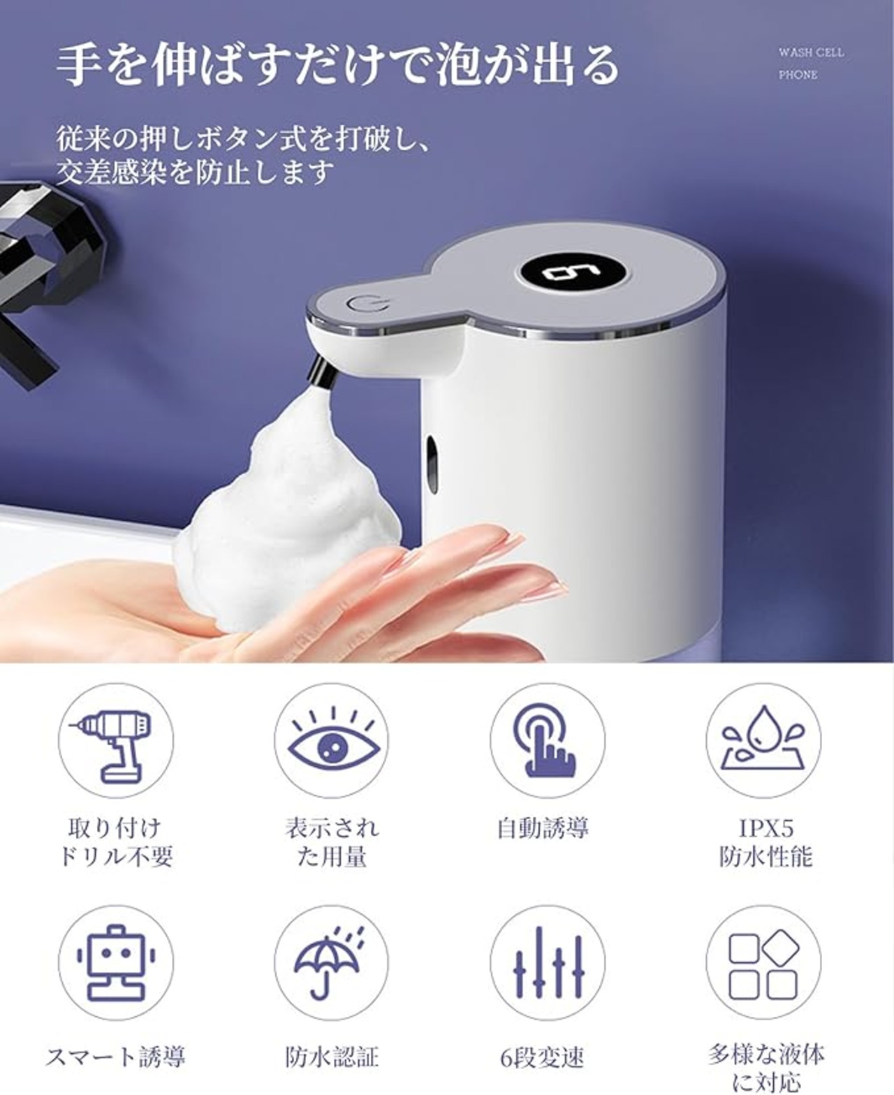 ソープディスペンサー 手洗い石けん 自動 非接触 衛生的 吐出量6レベル調整 細かい泡 オートディスペンサー 400ml 壁掛け ディスペンサー 半透明ボトル 充電式 節水設計 キッチン 洗面所 オフィスに最適