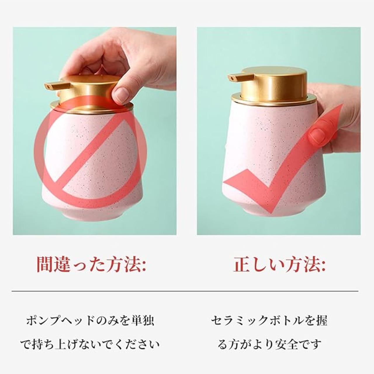 【セラミック製ソープボトル】良質のセラミックのボトル、プラスチック製より洗いやすく劣化しません。梨地の釉面工芸、北欧風のデザイン感です。マットな質感のポンプ、肌触りが心地よいし、水染みが残りません。