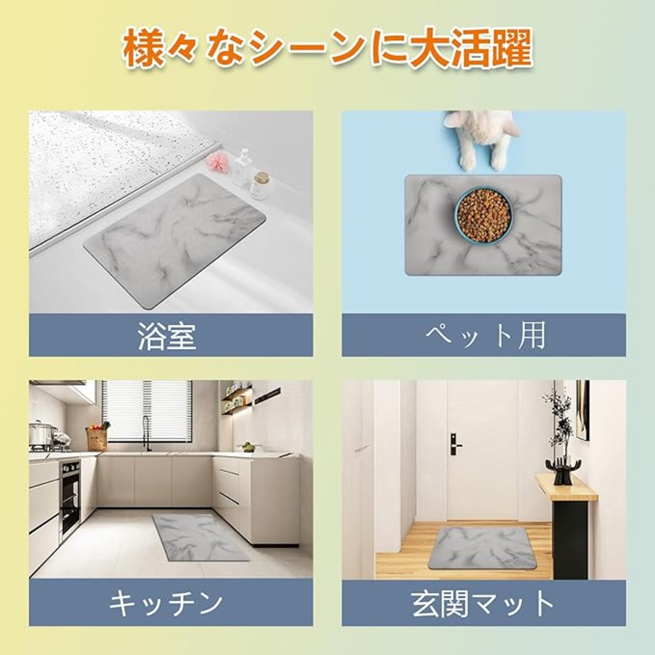 ★【商品仕様】サイズ:約40*30*0.5cm.この新型バスマットは通常の硬質珪藻土バスマットより柔らかくて、足触りが快適で、お風呂上がりのリラックスタイムをより上質なものにすることができます。