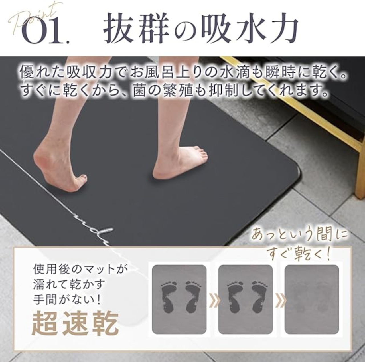 優れた吸収力で、お風呂上りの水滴も瞬時に乾く。すぐに乾くから、菌の繁殖も抑制してくれます。