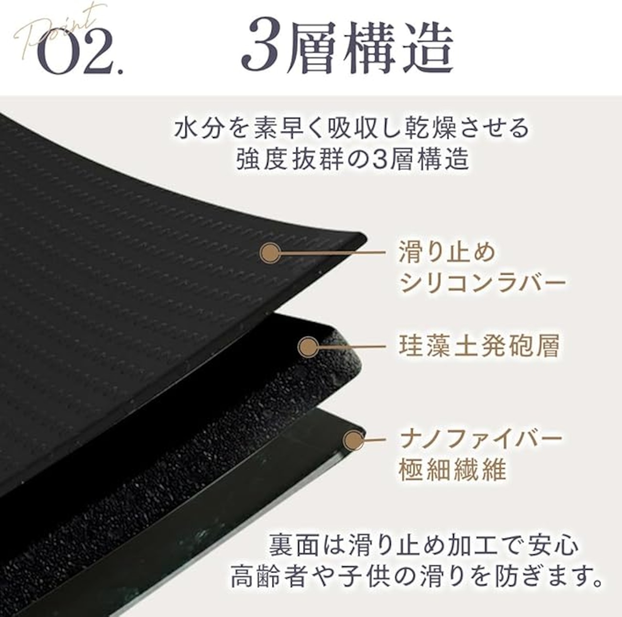 水分を素早く吸収し乾燥させる、強度抜群の3層構造!裏面は滑り止め加工で安心。高齢者や子供の滑りを防ぎます。