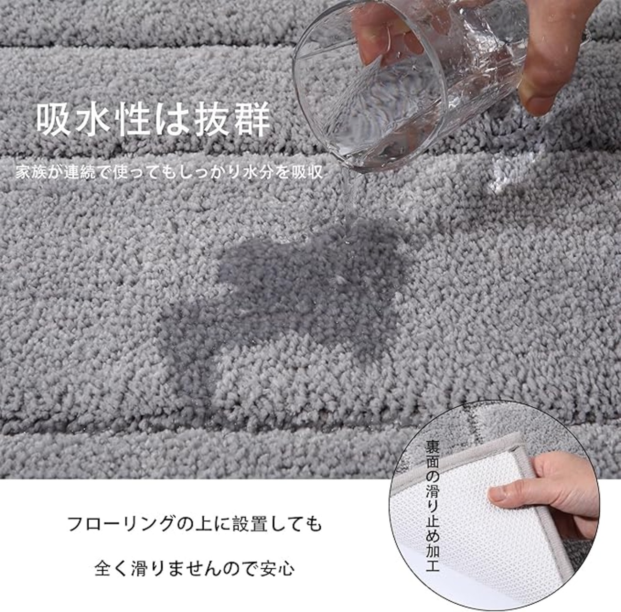 【滑り止め加工】裏面にはTPR素材で滑り止め加工が施されているので、しっかりと、ズレにくい、濡れた床の上でもしっかりと固定されてズレることがありません。マットの裏面は、床が傷つけません。利用する際、子供や、お年寄りにも安心で、滑るのは心配しません。