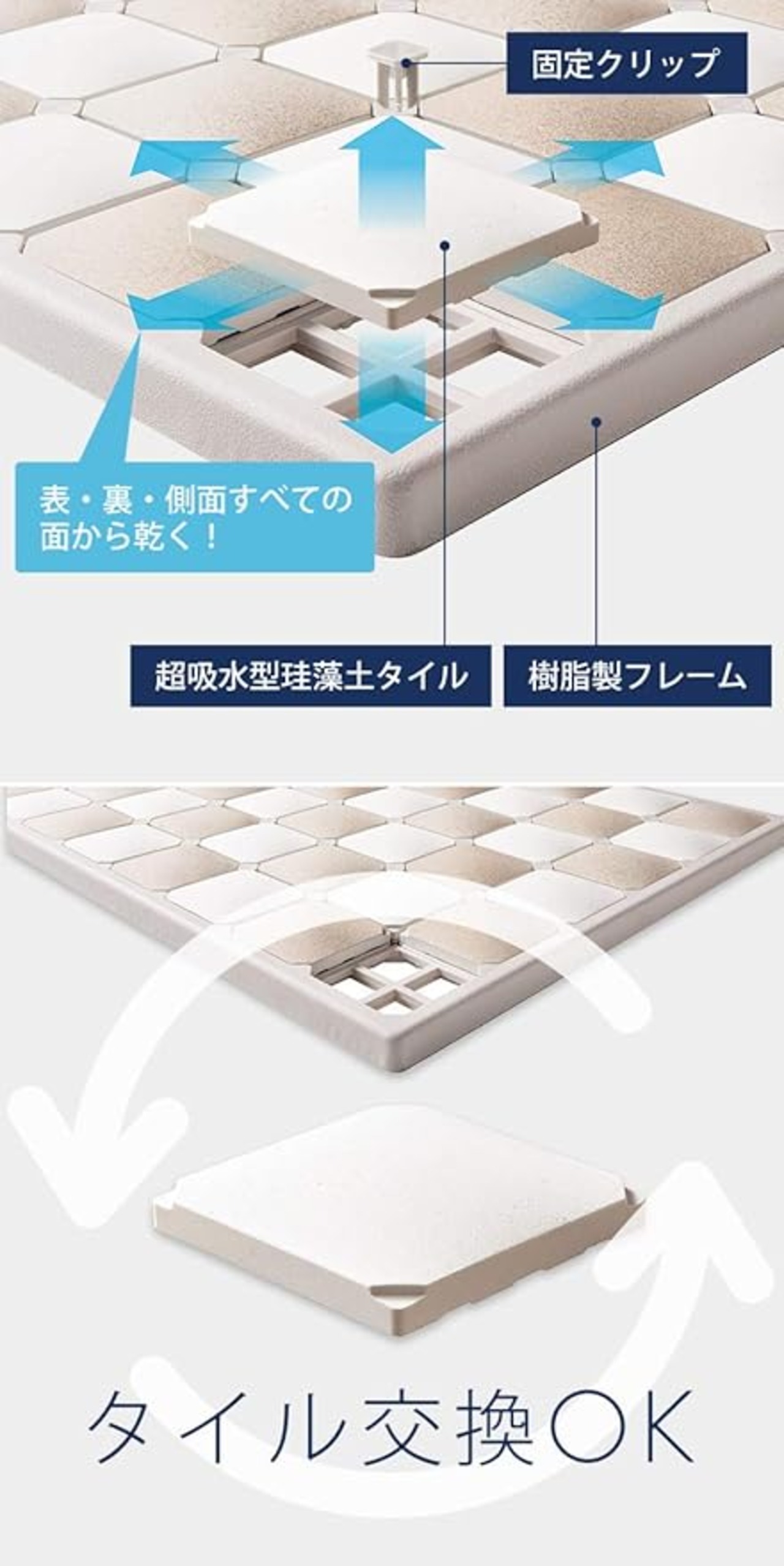 材質 タイル:珪藻土 フレーム・固定クリップ:ポリプロピレン すべり止めシート:EVA樹脂