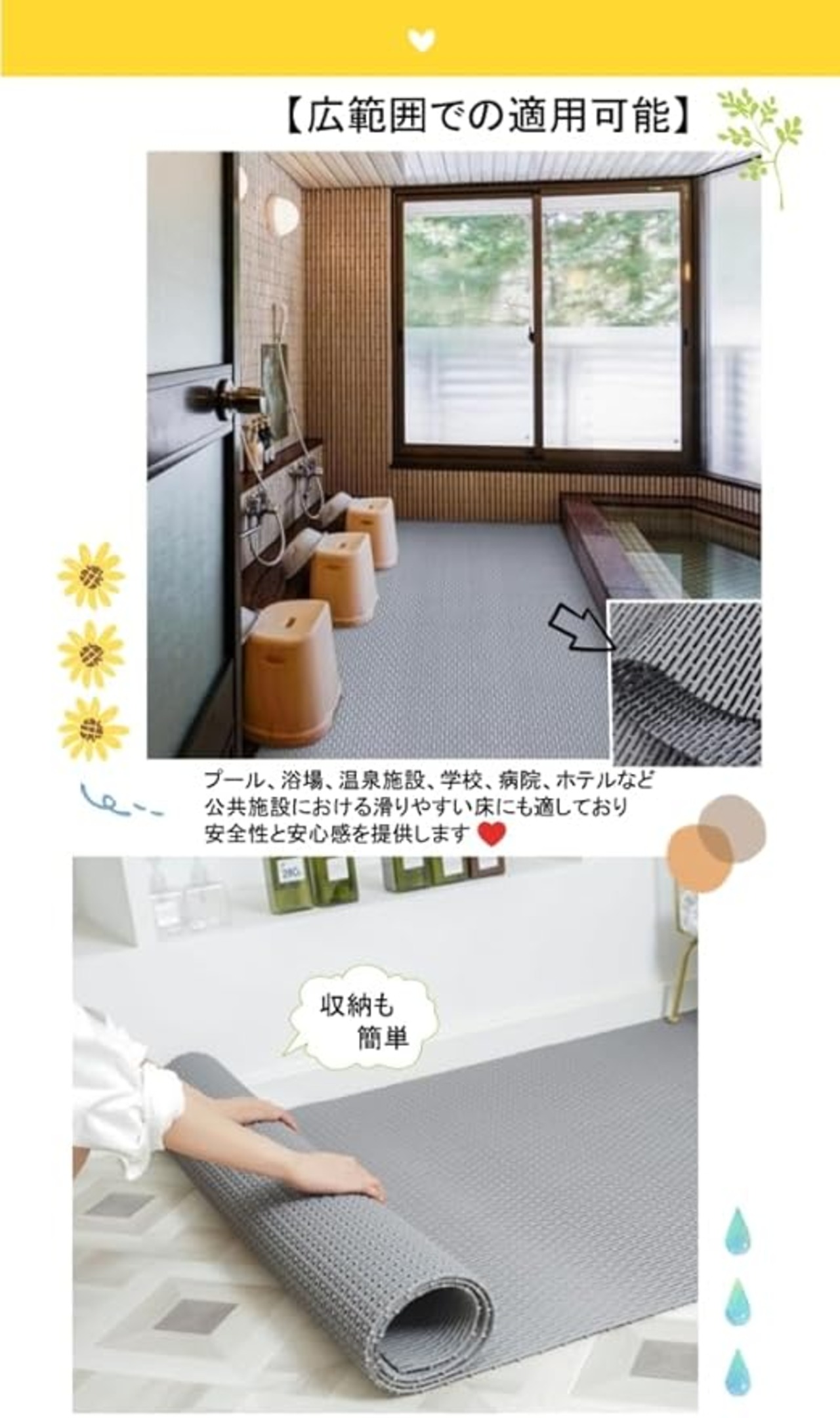【広範囲での適用可能】バスルーム、シャワールーム、プール、浴場、温泉施設、キッチン、廊下、階段、バルコニー、玄関をはじめ、学校、病院、ホテルなどの公共施設における滑りやすい床にも適しており、安全性と安心感を提供します。