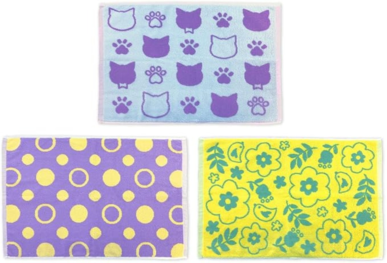 【洗い替え便利な】綿100%タオルバスマット 3柄組 (ねこ・ドット・花と小鳥)