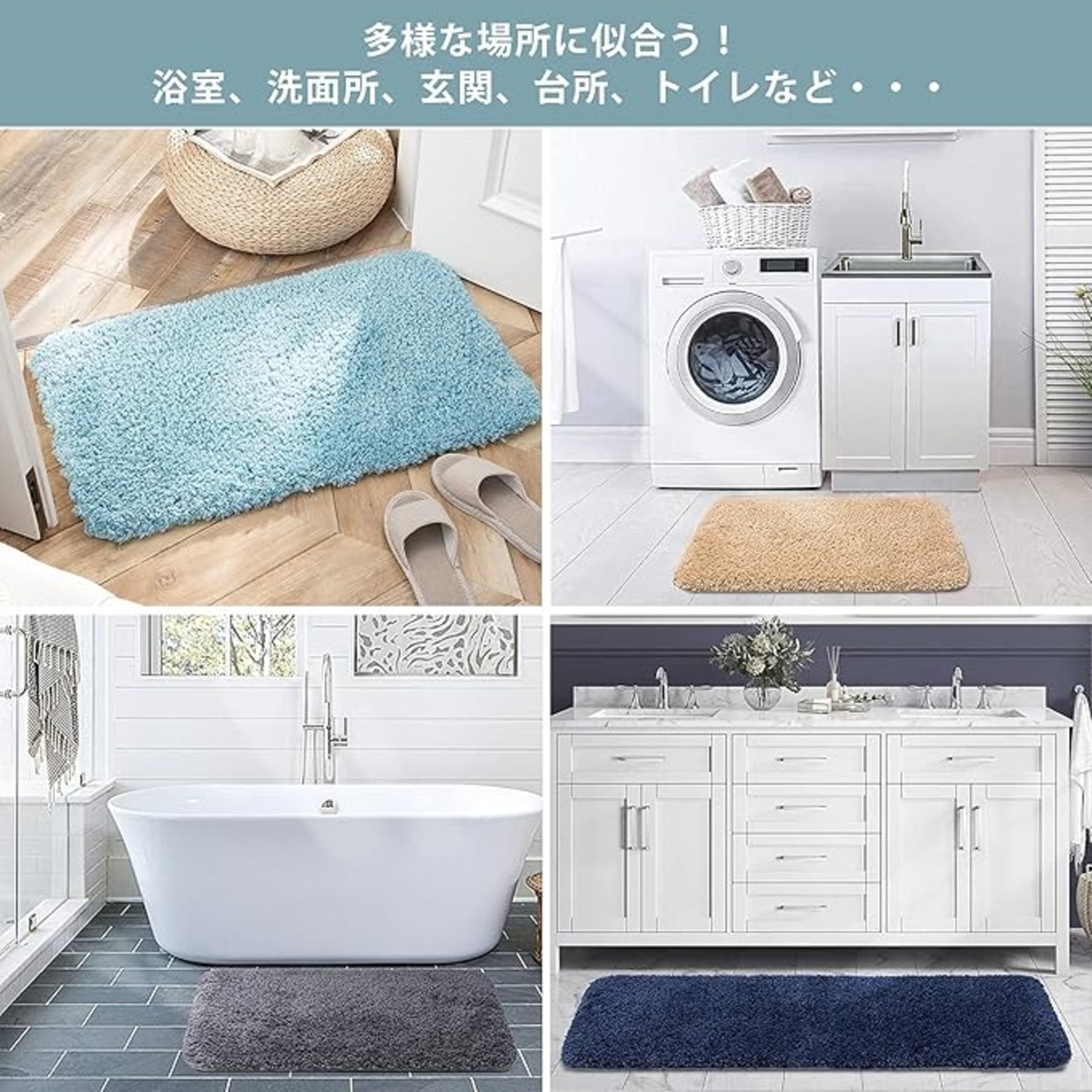 【毛長38mm! 柔かくて暖かい、寒い季節に最適!】38mmの毛長は普通の市販バスマットより2倍長く!ふんわり安心できる素材を使い、毛足は肌触りのよい極細マイクロファイバー繊維で作られたタオル地、柔かくて暖かい、秋や冬に最適!毛足が長いので、水分をすぐに吸い取り、柔らかくて暖かい触感で足に優しい。抗菌防臭素材を厳選し、浴室、台所、トイレ、玄関などの多様なシーンに応じて、8色と5タイプのサイズが用意しております。ご家族の安心するため高品質な匂いなく、特殊色染める技術処理して色落ちにくい、長く使っても新品感ままです。