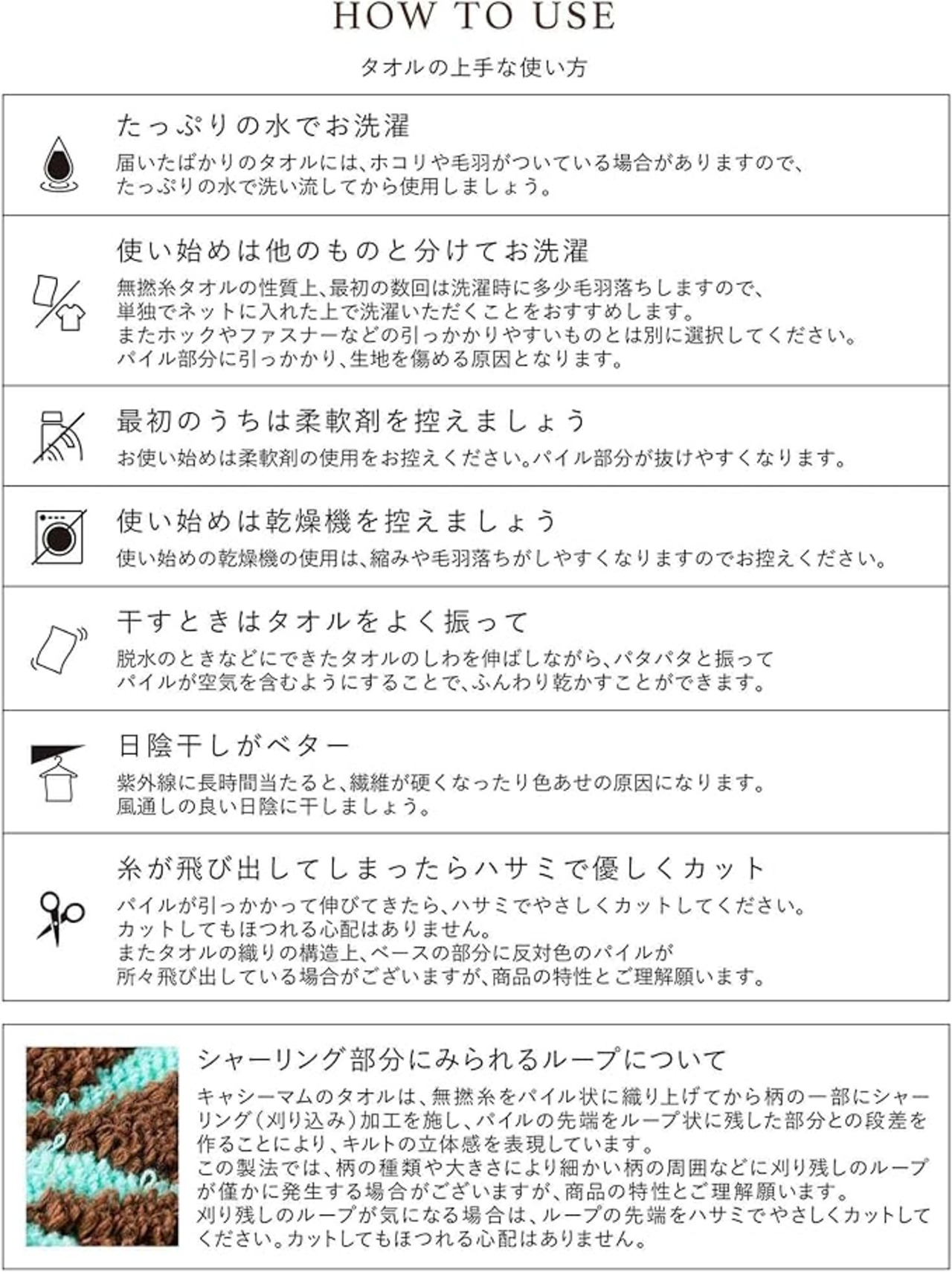 ※タオルの性質上お使い始めは多少毛羽落ちしますので単独でネットに入れた上で洗濯頂く事をお勧めします。