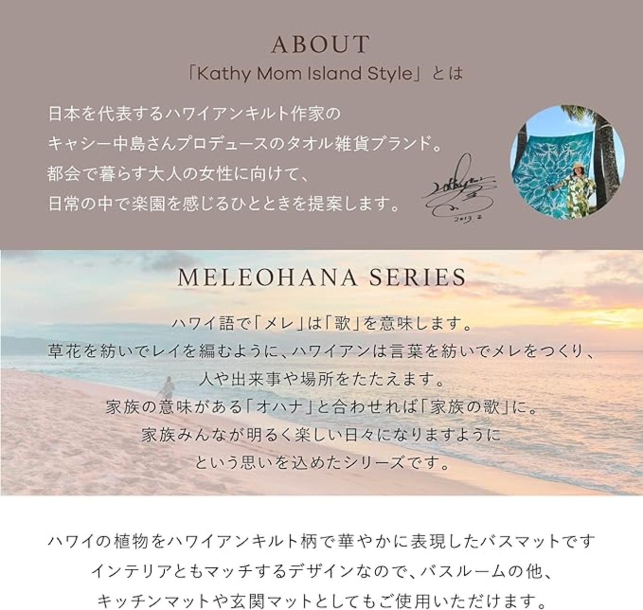 【Kathy Mam Island Style(キャシーマム アイランドスタイル)のバスマット ハワイアンキルト柄 メレオハナシリーズ】ハワイアンキルト作家、キャシー中島さんプロデュースの、ハワイで愛されている花や植物をデザインした、リゾート感あふれるバスマットです。 しっかりとした厚手のパイル地を使用しているので、シワにならずにすっきりと敷くことができます。 裏側には滑り止めがついているので、安心してお使いいただけます。 インテリアともマッチするデザインなので、バスルームの他、キッチンマットや玄関マットとしてもご使用いただけます。ムの思いを込めたシリーズ。