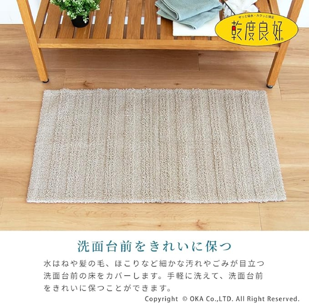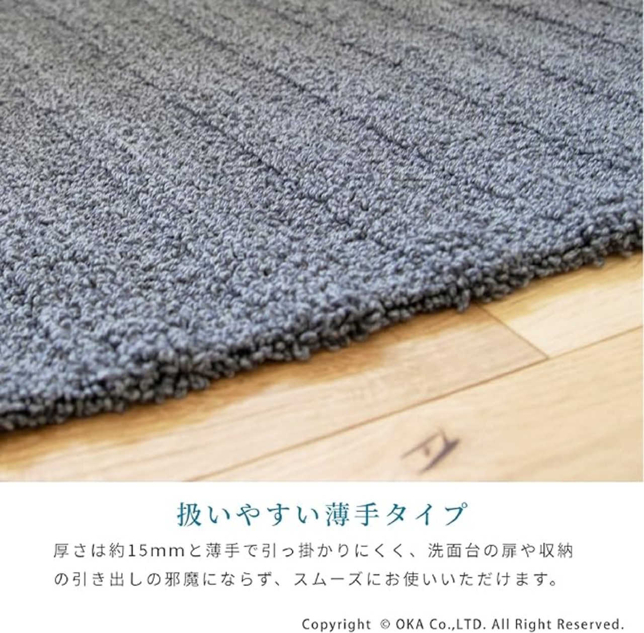水はねや髪の毛、ほこりなど細かな汚れやごみが目立つ洗面台前をカバーする薄手のマットです。乾きが速く洗濯しやすいので、手軽に洗えて洗面台前をきれいに保つことができます。