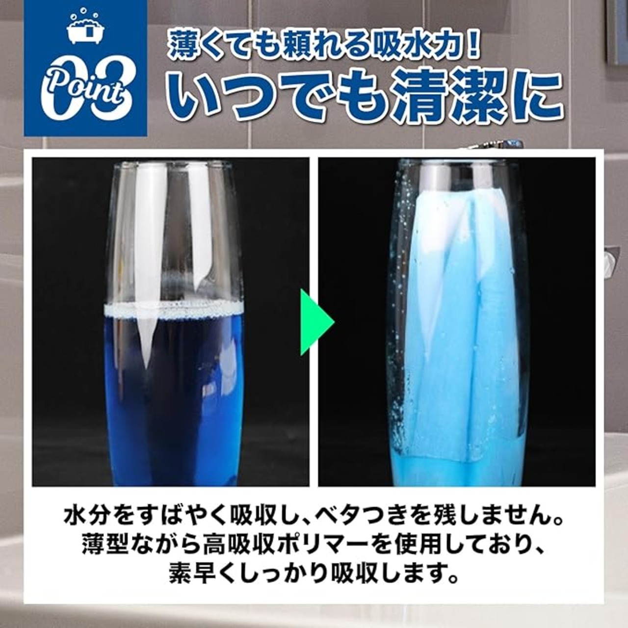 【使い方は自由|水まわり全般に】バスマットの上に敷いて補助用としても便利。こぼれた液体の吸収や、ペットの排泄物の拭き取りにも活躍します。液体の上にポンと置くだけでしっかり吸収。再利用はできませんが、その分衛生的で、片付けも楽々です。
