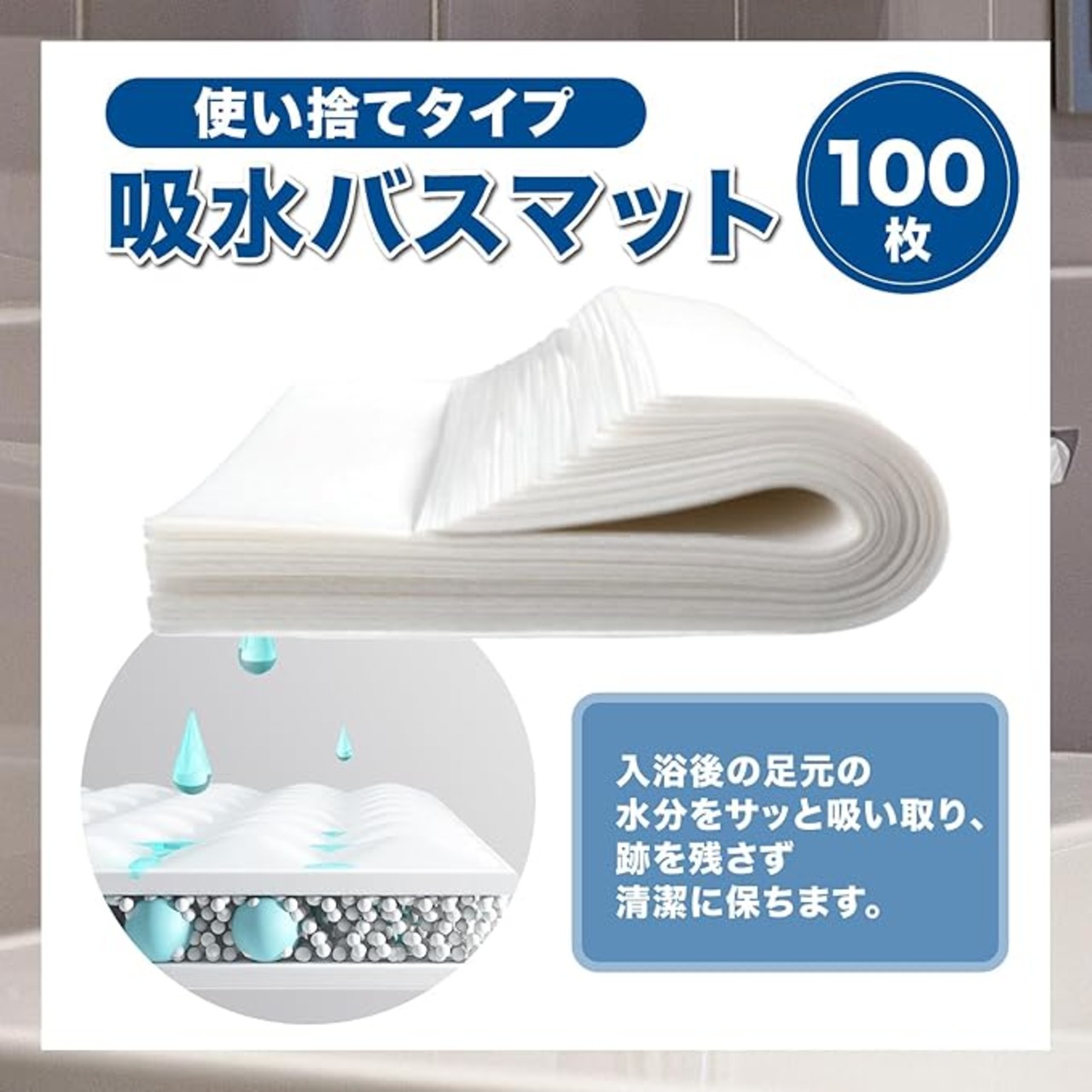 【吸水バスマットで手間なく快適】使い捨てタイプの吸水バスマット100枚。入浴後の足元の水分をサッと吸い取り、跡を残さず清潔に保ちます。25 30cmと30 40cmからサイズを選べ、家庭や宿泊施設など多用途に使いやすい仕様。毎回取り替えられるので衛生的で、洗う手間もなく手軽に使えます。