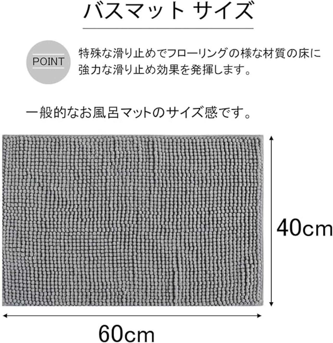 様々なシーンで活躍! 風呂場だけでなく、脱衣所、洗面所、玄関など、様々な場所で活躍する多機能マットです。シンプルなデザインと40x60cmの使いやすいサイズで、どんなインテリアにも馴染みます。吸水マット、足拭きマットとして、快適な生活をサポートします。