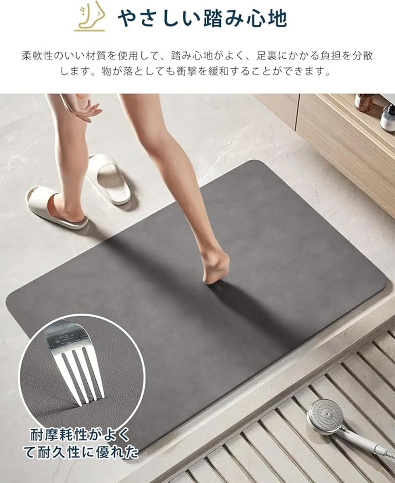 【柔軟で快適なバスマット】 従来の硬い珪藻土バスマットとは一線を画す、柔らかな肌触りと心地よい使用感が特徴です。また、安定した滑り止め効果があり、安全性を確保します。足元へのやさしさと安定感を兼ね備えた究極のバスルームアイテムです。