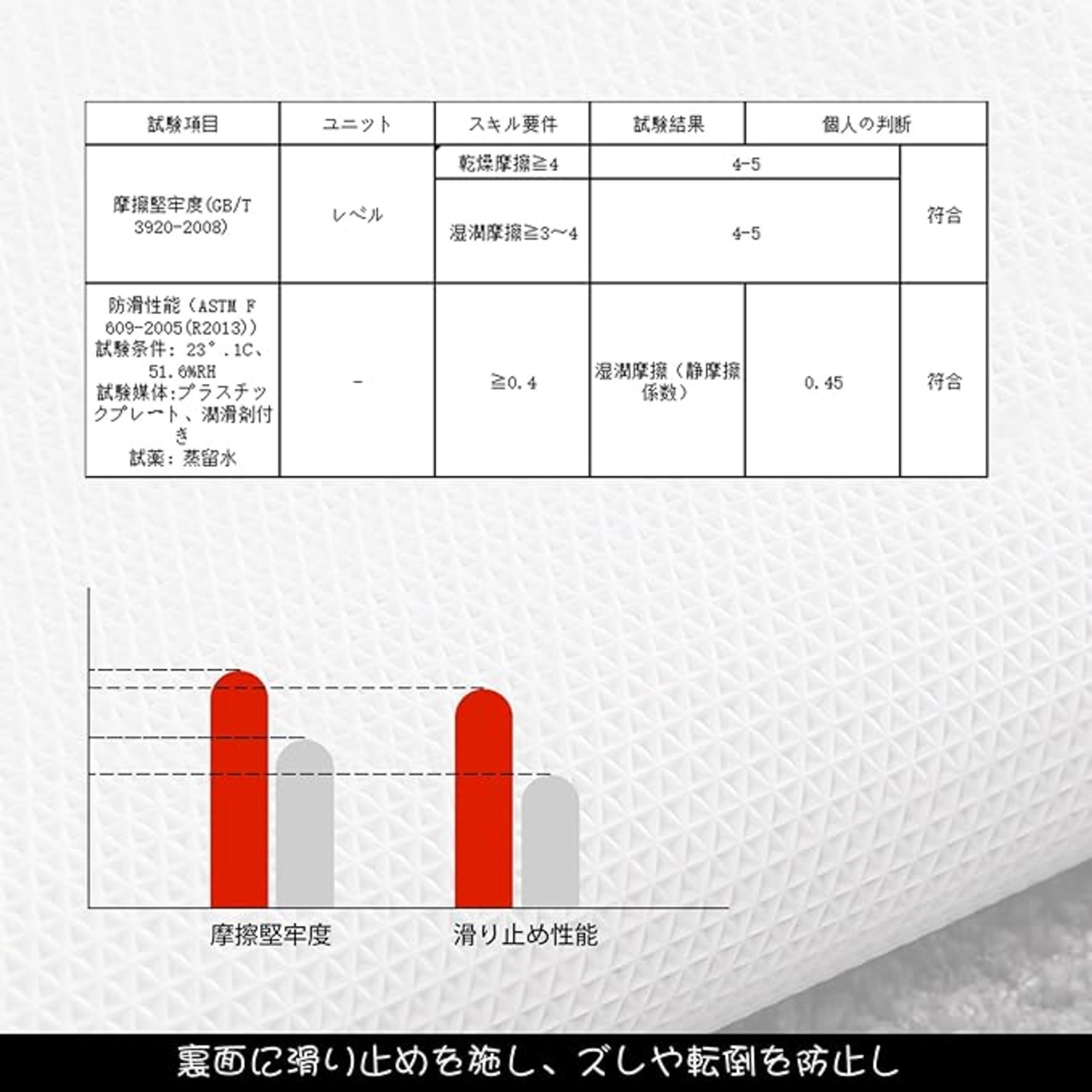 【滑り止め付き】裏面に滑り止めを施し、ズレや転倒を防止し、バスルームなど湿気や水気の多い場所でもお年上やお子様などの安全をしっかりお守りします。また地面にフィットし、水は浸透しないので、耐摩耗性材料は床を保護することになります。