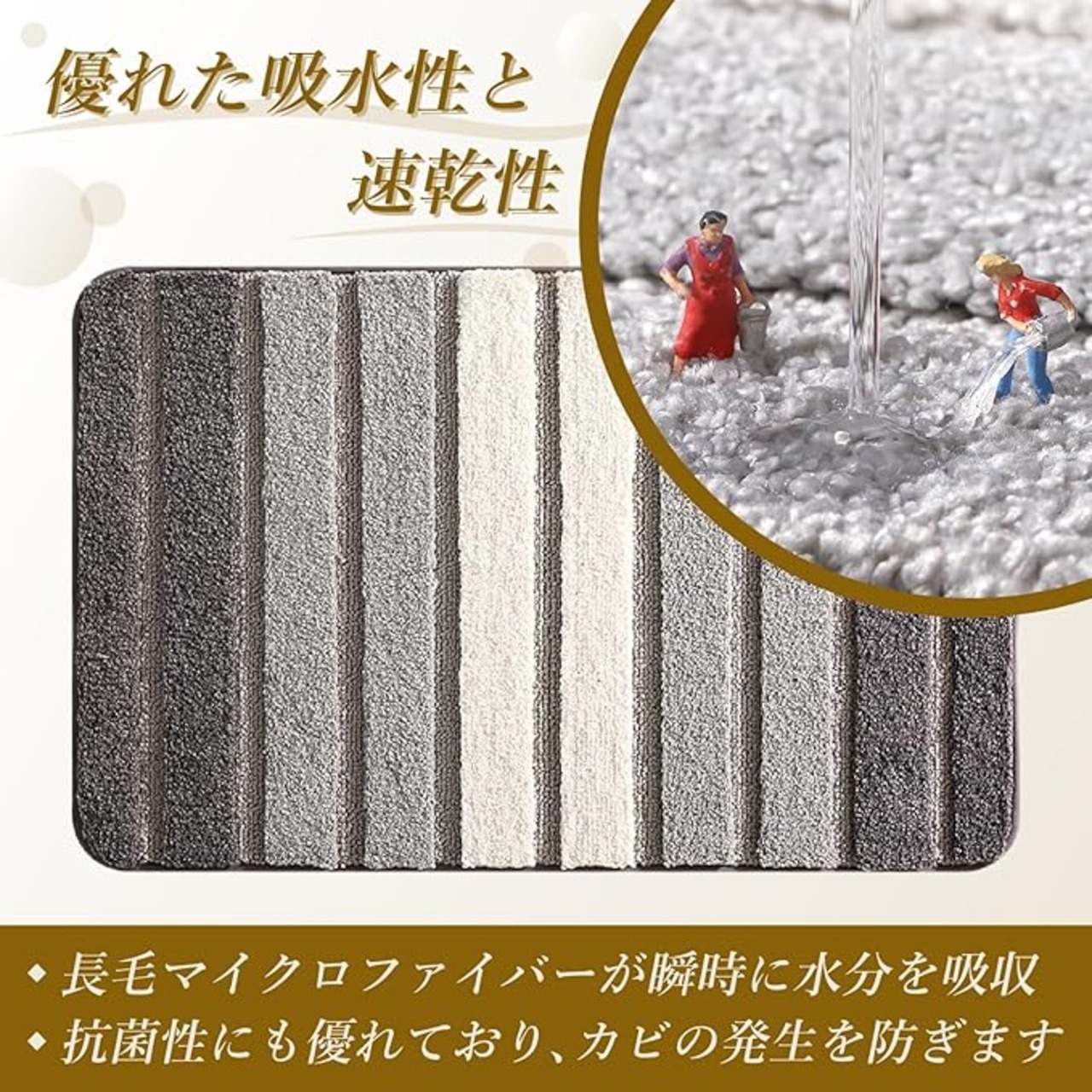 【抜群の吸水力と速乾性】 Crystal craftのグレーカラーの浴室足ふきマットは、優れた吸水性と速乾性を誇ります。長いマイクロファイバーが瞬時に水分を吸収し、速やかに乾燥させることで、いつでも清潔に保ちます。抗菌性にも優れており、カビの発生を防ぎます。