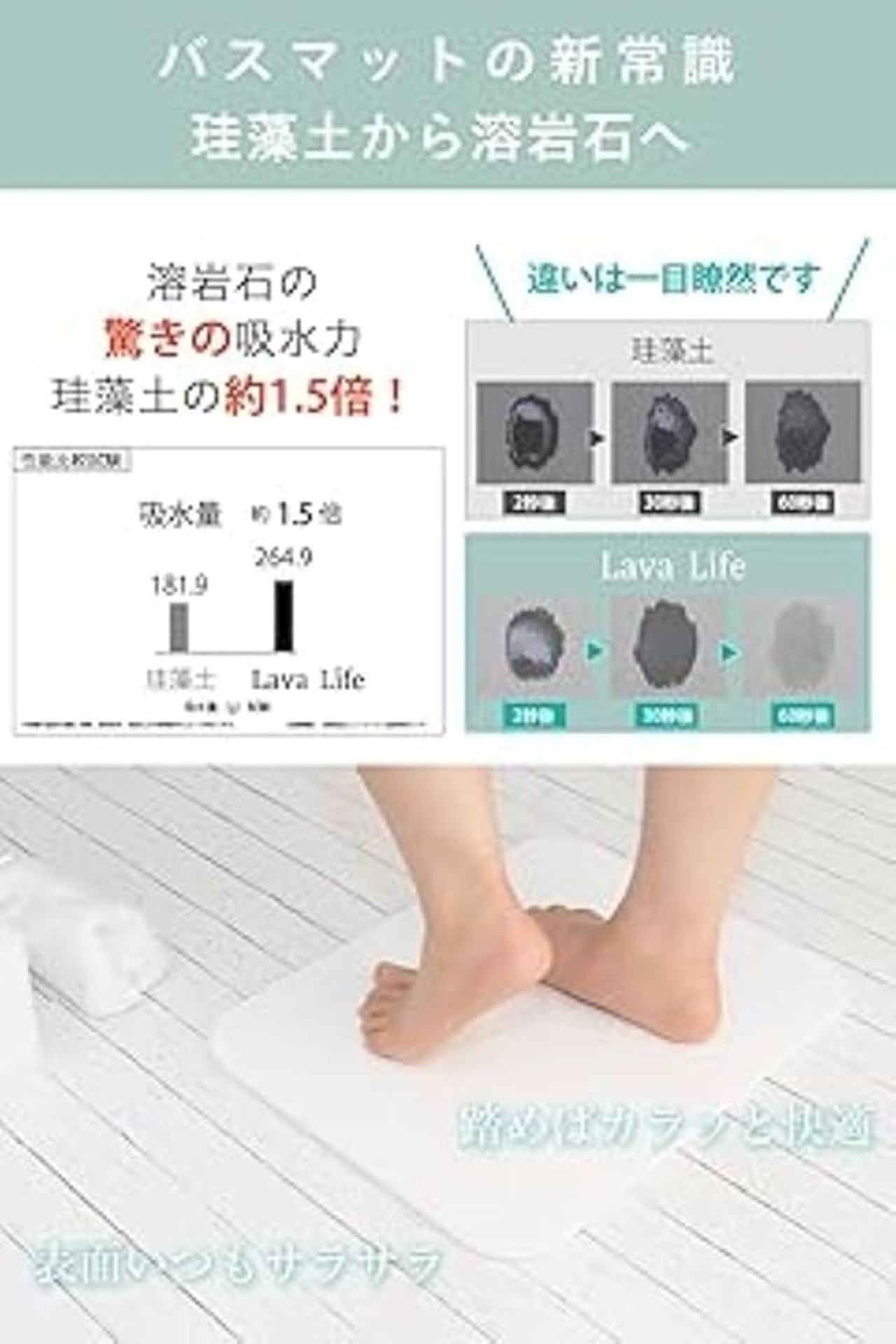 バスマットは次の時代へ。Lava Lifeは次世代の素材”溶岩石(火山岩)”を使ったバスマットです。表面には小さな穴が無数空いており、水分の吸収や放出、消臭の機能に優れています。