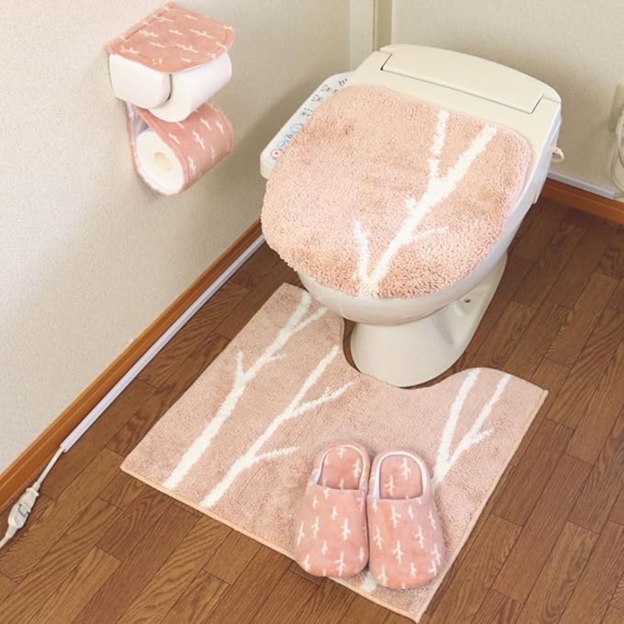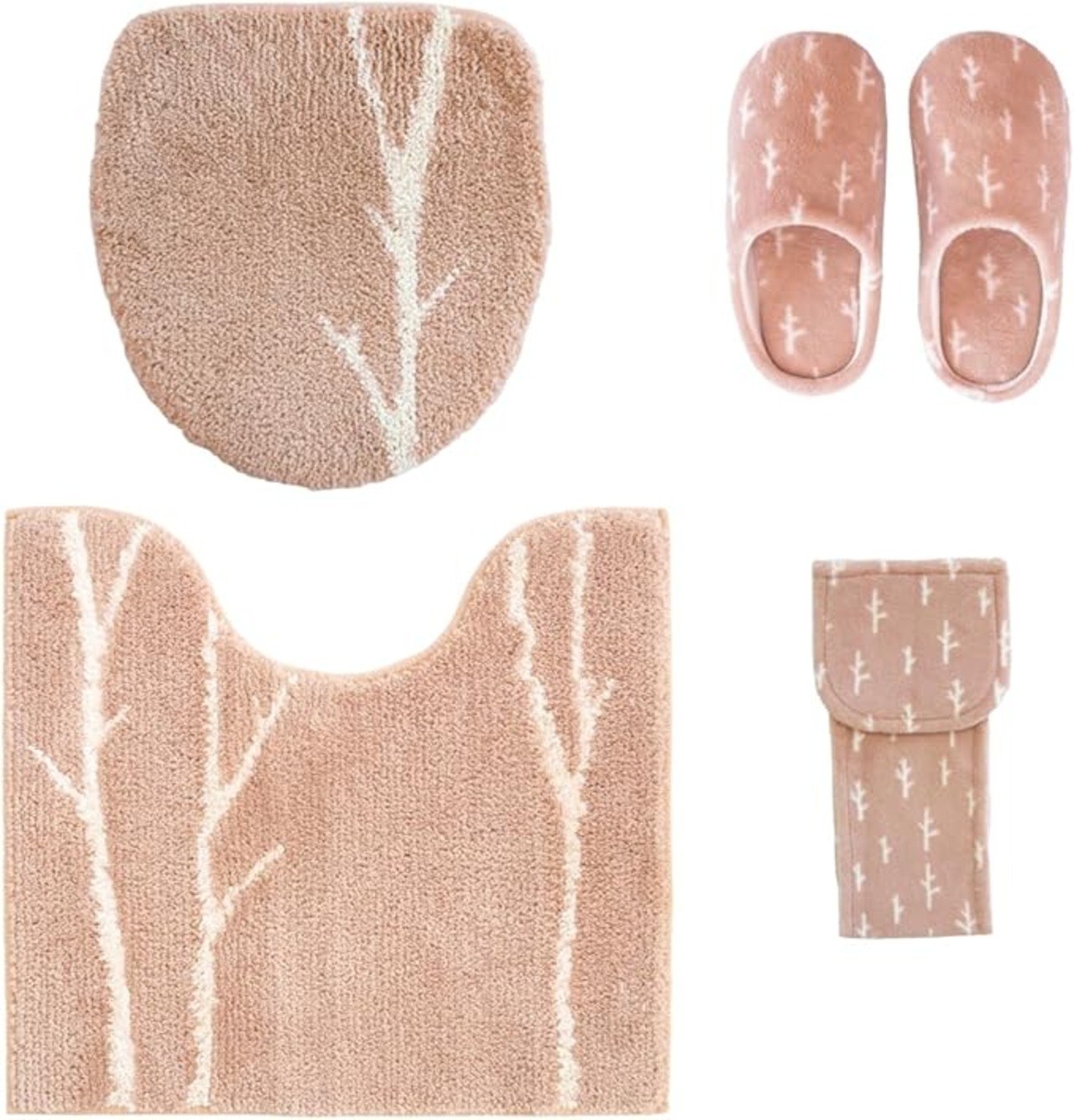 ●共用ふたカバー、普通サイズトイレマット、ペーパーホルダーカバー、スリッパの4点セット。※洗浄暖房の有る無しにかかわらずお使い頂けます。(適合はありますので、適合をご確認ください)●白樺の木が大人っぽく、シンプルでナチュラルな北欧デザインのトイレシリーズです。●ベージュに寄せた優しげなピンクとモダンなグレーが大人カラーで落ち着きある色合いになっています。●手触りが優しく、白樺の柄をデザインしたオリジナルの生地を使用しています。●吸着タイプのフタカバーです。●トイレマットの裏側には滑り止め加工がされております。●丸洗いができるのでいつも清潔です。※セット 1:共用ふたカバー  2:トイレマット(約55cm 60cm ) 3: ペーパーホルダーカバー  4:スリッパ※商品詳細吸着型ふたカバー:対応フタタイプ:普通型、洗浄・暖房型共通吸着シート取付で簡単に脱装着が可能です。本体サイズ:約42 40 2cm 重量: 160g素材:ポリエステル100%、吸着シート アクリル樹脂生産国:中国※ふたカバー適合:適合します:40〜46cm  奥までかかりませんが装着可能:47〜52cm (フタ長さ+前部厚)※自動開閉機能付きのトイレでは自動開閉機能はお使いになれません。トイレマット(レギュラー):本体サイズ:約55cm 60cm(マットの高さ 約16mm)首下 約40cm 重量: 290g色 ピンク グレー素材:ポリエステル100%、裏面滑り止め加工 (首下 約40cm)生産国:中国※裏面はすべり止め加工でずれにくくなっています。程よい厚みでふかふか感のあるマットに仕上がりました。ペーパーホルダーカバー:設置タイプ 自己粘着性ロール数 1素材:ポリエステル100%、成型部品 ポリプロピレン生産国:中国重量:60グラム※成型部品がペーパーホルダーの隙間(※厚さ4mm以上、幅113mm以上)に差し込める場合は装着可スリッパ:縦 約29cm 横 約24cm 高さ 約8cm 足のサイズ:約25cmまで  重量:145g素材:ポリエステル100%生産国:中国※当商品は衛生商品ですので、返品をお請けできません。※ 【お洗濯をする場合のご注意点】・乾燥機はご使用にならないで下さい。(熱により変形・損傷の恐れがあります)・柔軟剤や漂白剤はご使用にならないで下さい。・ドラム式などの一部の形式の洗濯機はご使用できない場合があります。洗濯機の取扱説明書をよくご確認の上、洗濯して下さい。・家庭用洗剤をご使用の上、洗濯機での丸洗いは洗濯ネットをご使用下さい。・初めは多少毛が抜けますので、他の物とは別にして下さい。・この製品に使用しているゴムは直射日光に弱い性質があります。必ず陰干しにしてください。