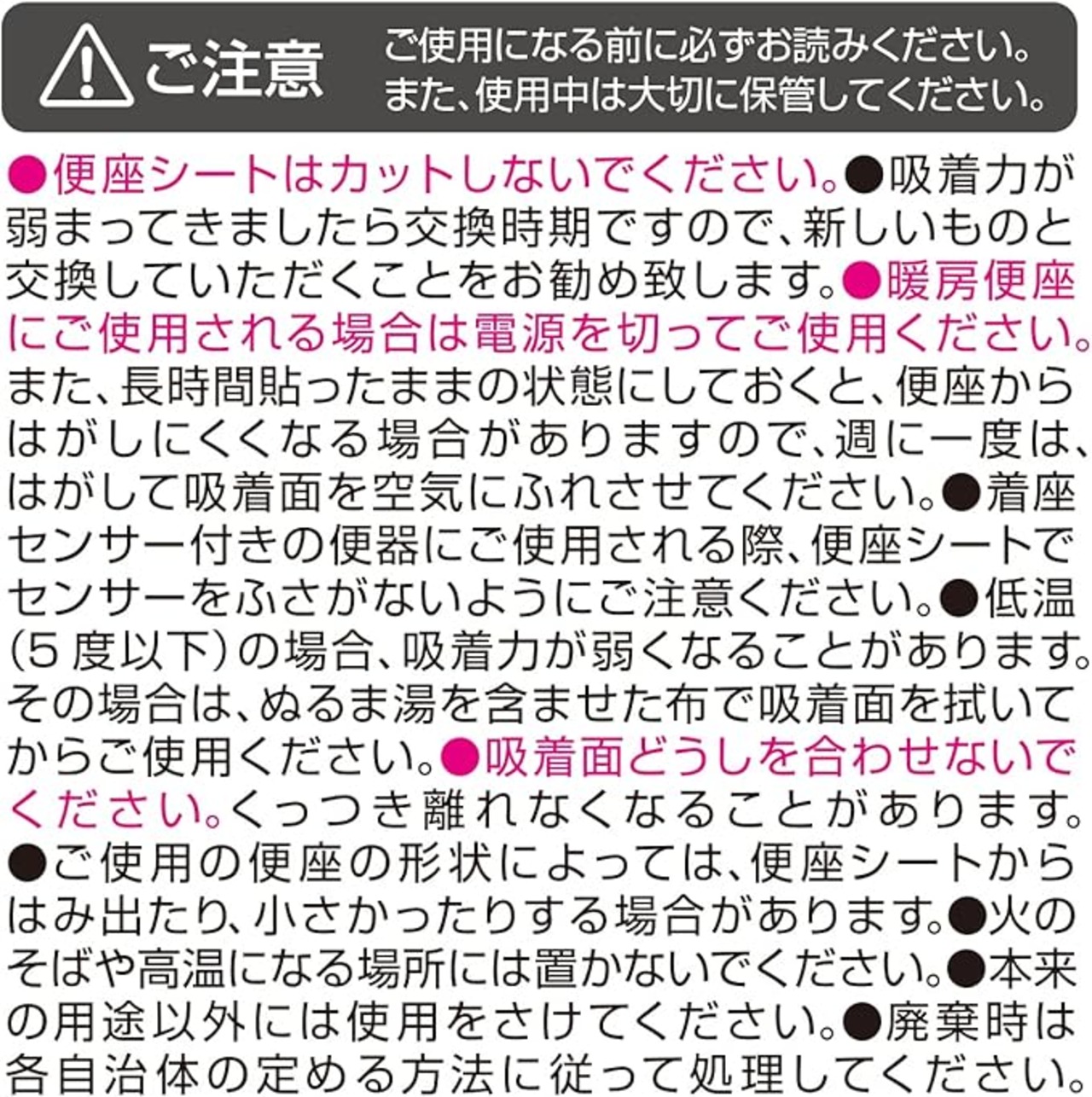 【ご使用上の注意】▼便座シートはカットしないでください。▼吸着力が弱まってきたら交換時期ですので、新しいものと交換していただくことをお勧め致します。▼暖房便座にご使用される場合は電源を切ってご使用ください。▼洗濯の際は乾燥機は使用しないでください。