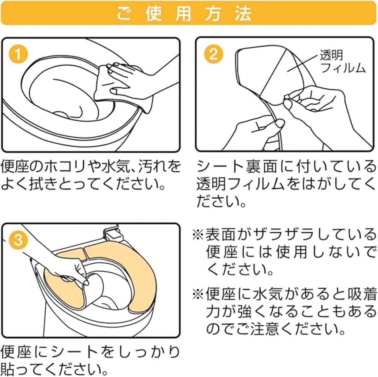 【ご使用方法】1)便座のホコリや水気、汚れをよく拭きとってください。2)シート裏面に付いている透明フィルムをはがしてください。3)便座にシートをしっかり貼り付けてください。 O型・U型・洗浄暖房型のどの便座タイプでもご使用いただけます。