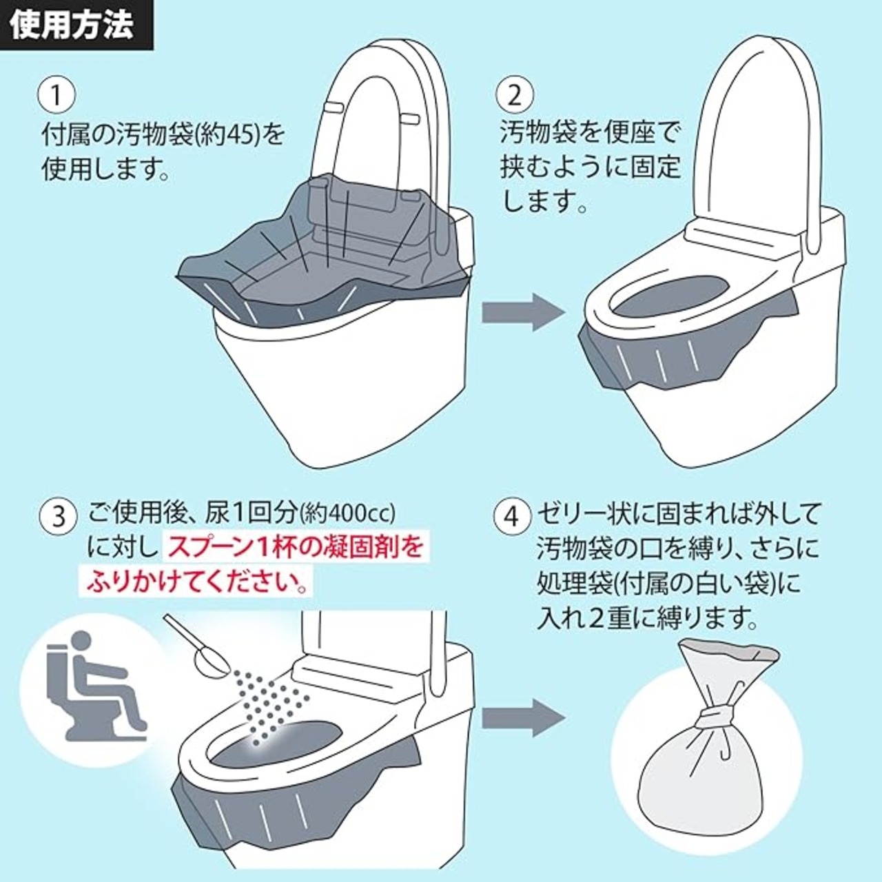 [セット内容]凝固剤400g(50回分)、汚物袋(650 800mm・約45L) 50枚、処理袋(180 450mm) 50枚、スプーン 1本