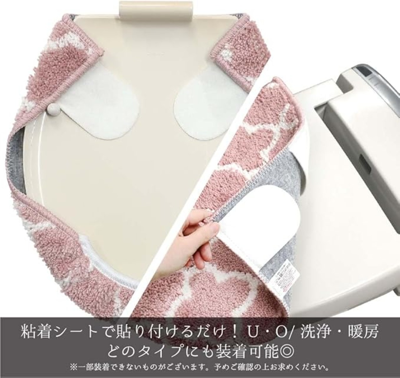 裏面に縫製された粘着シートにより、U・O型/洗浄・暖房タイプ、どの型にも対応できるフタカバーです。