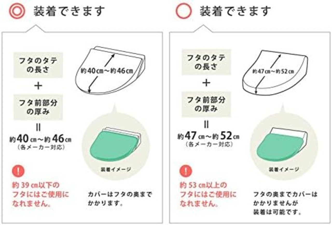 ※当商品は衛生商品ですので、お客様都合による返品をお請けできません。 ※適合サイズ: ◎ お使い頂けます。 40~46cm / 〇 奥までかかりませんが装着可能です。 47~52cm (フタ長さ+前部厚) ※四い形状のフタには装着できません。(アラウーノなど) ※自動開閉機能付きのトイレでは自動開閉機能はお使いになれません。