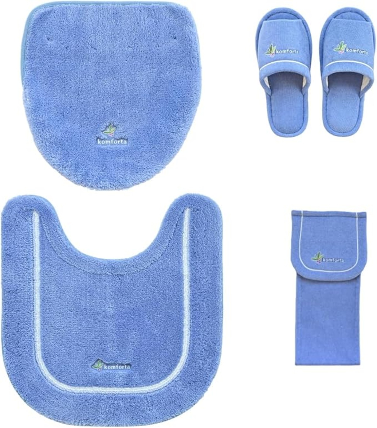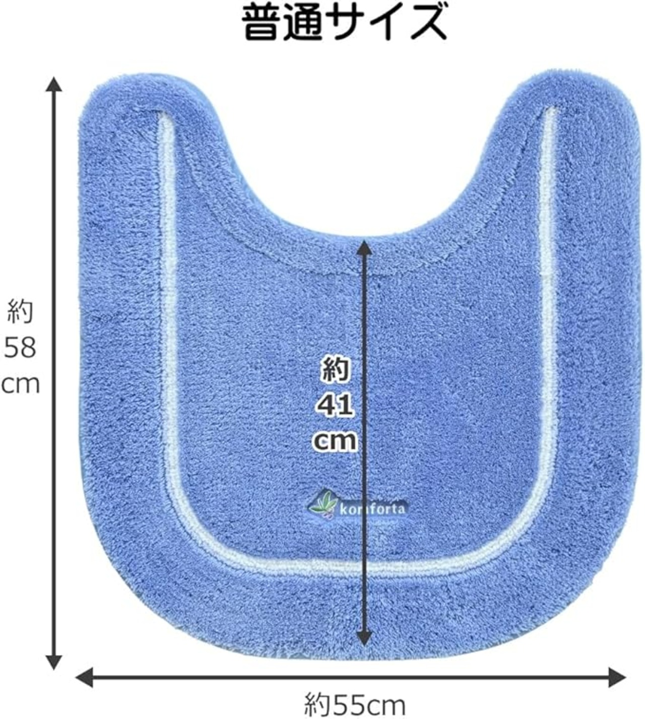 ●洗浄暖房型・普通型共用ふたカバー、普通サイズトイレマット、スリッパ、ペーパーホルダーカバーの4点セット。 ●洗浄暖房便座の有る無しにかかわらずご利用頂けます。●丸洗いができるのでいつも清潔です。 ●トイレ空間を爽やかにするような、シンプルさとあたたかさを合わせもったコムフォルタシリーズ第6弾の「コムフォルタ6」。 ●komfortaは、世界共通語で心地よいという意味です。 ●ワンポイントのロゴマーク付きで可愛らしさも感じる仕上がりになっています。 ●ほとんどの機種に適合できるよう吸着シートで貼り付けるタイプになっています。 ●洗濯ネットに入れて丸洗い可能です。 ※オカ コムフォルタ6 ※セット 1:共用ふたカバー 2:トイレマット(約58cm 55cm ) 3: ペーパーホルダーカバー 4:スリッパ 1:トイレマット 素材:アクリル65%、ポリエステル35% カラー:ブルー サイズ:約58 55cm(首下:41cm) 生産国:中国 備考:洗濯可能(洗濯機の取扱説明書をよくご確認の上、洗濯してください。) 裏面すべり止め加工 ころんとした丸みのあるフォルムが特徴的なトイレマットは、ワンポイントのロゴマーク付きで可愛らしさも感じる仕上がりになっています。 フタカバー 素材:アクリル65%、ポリエステル35% (吸着シート アクリル樹脂) カラー:ブルー サイズ 洗浄・暖房型、普通型兼用(ドレニモタイプ) 生産国: 中国 備考 洗濯可能(洗濯機の取扱説明書をよくご確認の上、洗濯してください。) ほとんどの機種に適合できるよう吸着シートで貼り付けるタイプになっています。 ペーパーホルダーカバー 素材:綿75%・ポリエステル25% (成型部品:ポリプロピレン) カラー :ブルー サイズ:約34 17 2cm 生産国:中国 洗濯可能 (成形部品は取り外してからお洗濯してください) お手入れ時にはサッと取外し、簡単に取り付けることができます。手で触れるものだからこそ汚れが気になりますが、洗濯ネットに入れて丸洗い可能なのでいつでも衛生的にお使いいただけます。 ※ペーパーホルダーカバーは、上下連結フックが差し込めないタイプのペーパーホルダーには使えません。 スリッパ 素材:綿75%・ポリエステル25% (裏面:塩化ビニル) カラー:ブルー サイズ:約27.5 23.5 10cm 生産国:中国 備考:洗濯可能 軽い履き心地で普段使いにもぴったりで、汚れやすいスリッパの裏面はサッと拭き取れます。 ※ 【お洗濯をする場合のご注意点】 ・乾燥機はご使用にならないで下さい。(熱により変形・損傷の恐れがあります)・柔軟剤や漂白剤はご使用にならないで下さい。・ドラム式などの一部の形式の洗濯機はご使用できない場合があります。洗濯機の取扱説明書をよくご確認の上、洗濯して下さい。 ・家庭用洗剤をご使用の上、洗濯機での丸洗いは洗濯ネットをご使用下さい。 ・初めは多少毛が抜けますので、他の物とは別にして下さい。・この製品に使用しているゴムは直射日光に弱い性質があります。必ず陰干しにしてください。 ●当商品は、通販用梱包の為、フタカバーの台紙を取り外しております。