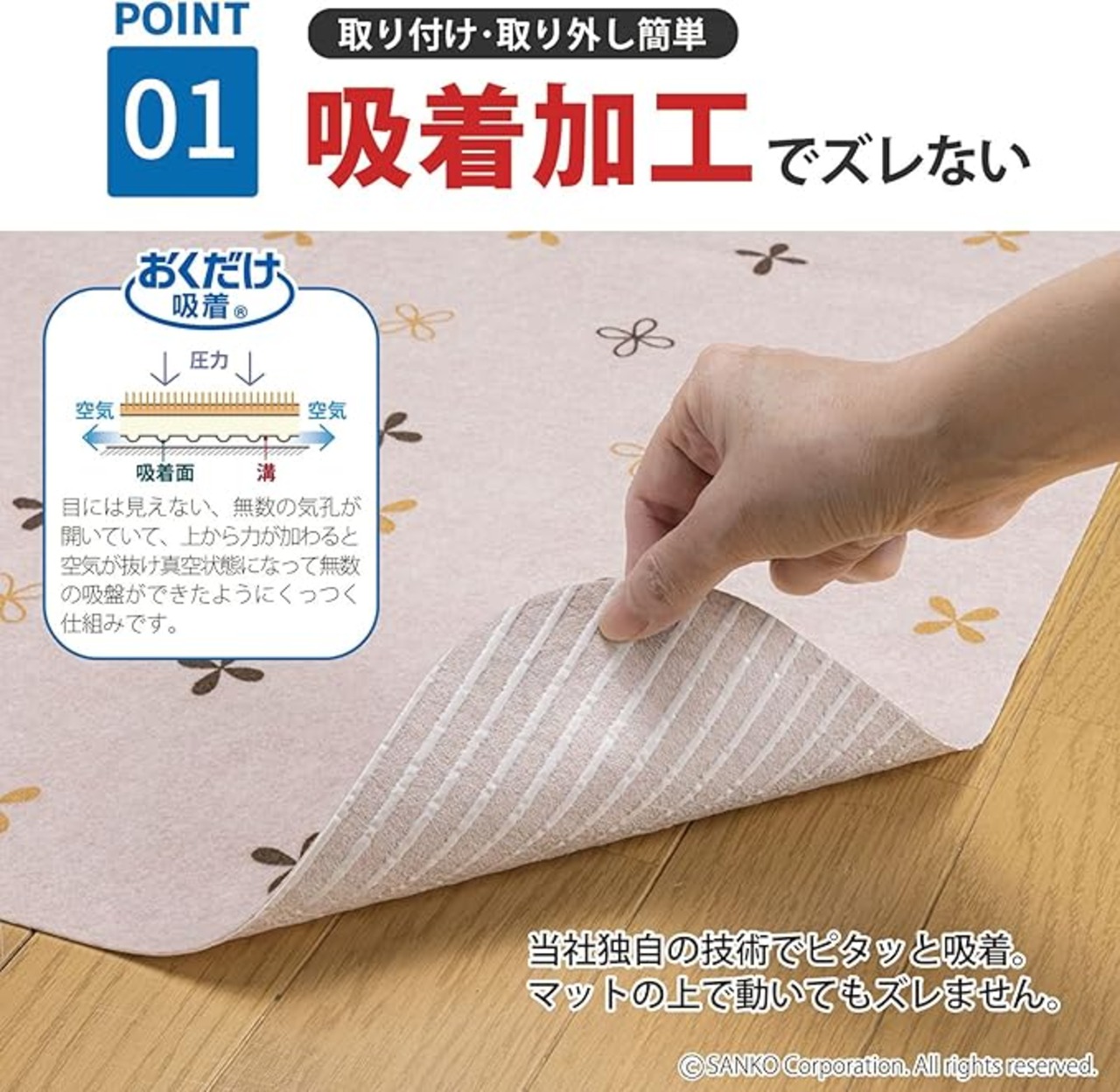 ポータブルトイレ用のマットです。生地は薄手タイプを使用していますので段差がなく、おくだけで吸着する加工を施しているため滑る心配もありません。サイズ90 70cm個装サイズ:40 26 3cm重量235g個装重量:235g素材・材質表面:ポリエステル100%裏面:アクリル樹脂(カテキン入り)生産国日本 おくだけでズレないポータブルトイレマット。------ ココがポイント! ------●汚れても簡単にはがして洗濯機で丸洗いできます。※無垢材などの表面が凹凸した面へは使用できません。GR使用イメージBE使用イメージポータブルトイレ用のマットです。生地は薄手タイプを使用していますので段差がなく、おくだけで吸着する加工を施しているため滑る心配もありません。