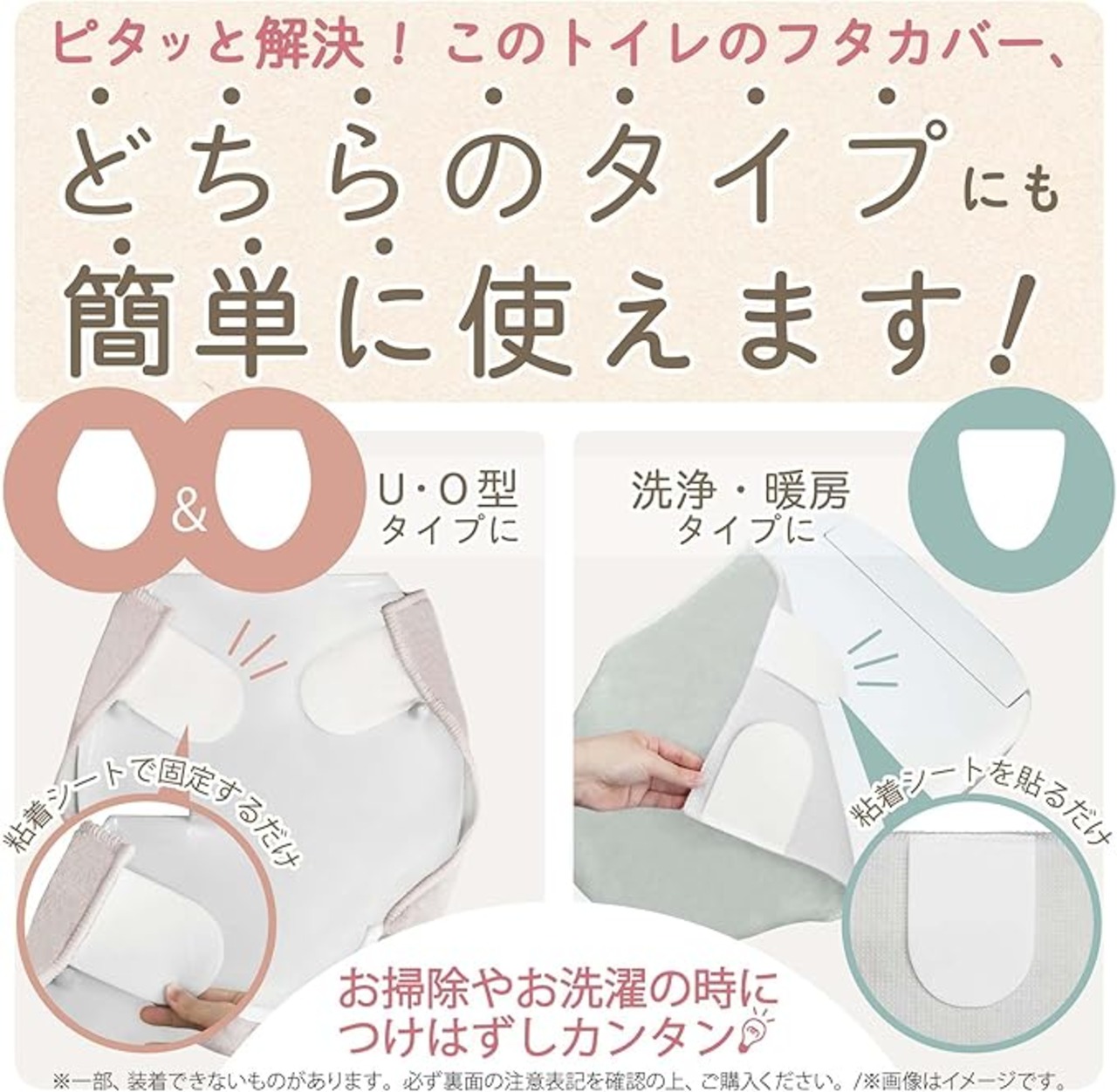 裏面に縫製された粘着シートにより、洗浄・暖房用/U・O型、どの型にも対応できます。