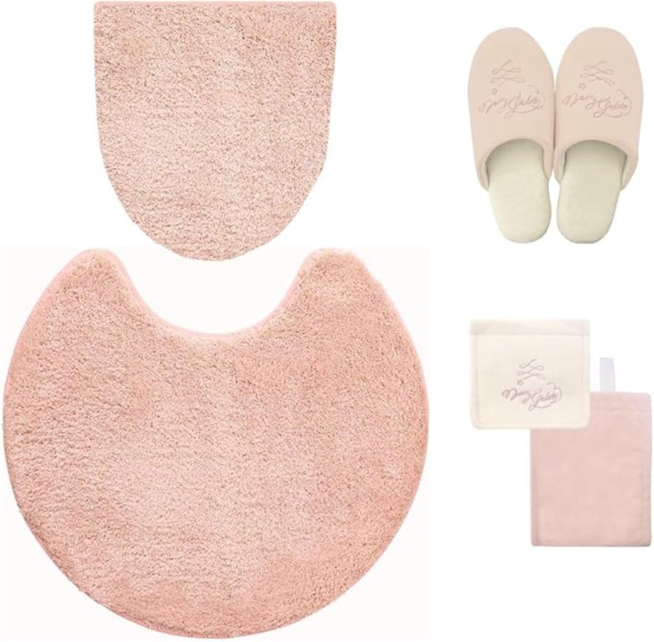トイレマット、吸着型フタカバー、 スリッパ、ペーパーホルダーカバーの4点セットです。 くすみのある淡いパステルカラーにマットとフタカバーがラメ糸入り。 パステルカラーのマットなので柔らかい雰囲気でどこに敷いてもなじみやすい。 「merry」=楽しいという意味の通り、楽しく柔らかな空間をつくります。 丸洗いOKで吸水力に優れた糸を使用しており刺繍部分は銀糸で施すなど細部までこだわっています。 裏面にはすべり止め加工が施されているのでずれにくく快適にお使い頂けます。 全てのアイテムは丸洗い可能なので汚れてしまったら洗濯機でお手入れがOK。 セット内容 トイレマットサイズ:約55 60cm 材質:パイル部/ポリエステル100% 洗濯機対応:可(洗濯ネット使用) ドラム式洗濯機対応:不可 乾燥機対応:不可 ※裏面すべり止め加工つき フタカバーサイズ:約 縦 40 横 48cm 素材・材質:パイル部/ポリエステル100% 洗濯機対応:可(洗濯ネット使用) ドラム式洗濯機対応:不可 乾燥機対応:不可 ペーパーホルダーカバー サイズ:約幅17 奥行き16 高さ0.5cm (上部の寸法) 重量:約50g 素材・材質:ポリエステル・レーヨン・その他 ※一本支柱タイプのトイレットペーパーホルダーにはご使用いただけません。 スリッパ サイズ 約24cm 素材・材質: 表生地:ポリエステル・レーヨン・その他 共通 生産国:中国 メーカー:オカトー(株) ※自動開閉機能付きのトイレでは自動開閉機能はお使いになれません。 ※ペーパーホルダーカバーは、上下連結フックが差し込めないタイプのペーパーホルダーには使えません。 ※当商品は衛生商品ですので、返品をお請けできません。 ※ 【お洗濯をする場合のご注意点】 ・乾燥機はご使用にならないで下さい。(熱により変形・損傷の恐れがあります) ・柔軟剤や漂白剤はご使用にならないで下さい。 ・ドラム式などの一部の形式の洗濯機はご使用できない場合があります。 洗濯機の取扱説明書をよくご確認の上、洗濯して下さい。 ・家庭用洗剤をご使用の上、洗濯機での丸洗いは洗濯ネットをご使用下さい。 ・初めは多少毛が抜けますので、他の物とは別にして下さい。 ・この製品に使用しているゴムは直射日光に弱い性質があります。必ず陰干しにしてください。 ●当商品は、通販用梱包の為、フタカバーの台紙を取り外しております。
