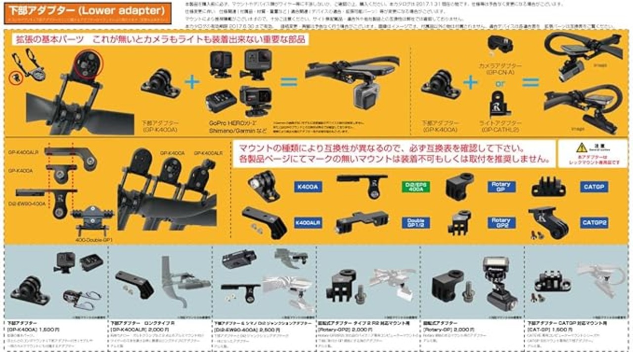 GP規格は ゴープロ HEROのカメラシリーズや シマノスポーツカメラ ガーミン Virb XEなどゴープロ互換カメラが装着が可能です.またライトアダプターを付ければライトの取付も 例 キャットアイなら 【GP-CATHL6】 レザインなら【GP-LEZ4】オーライトなら【GP-OLIGHT】など