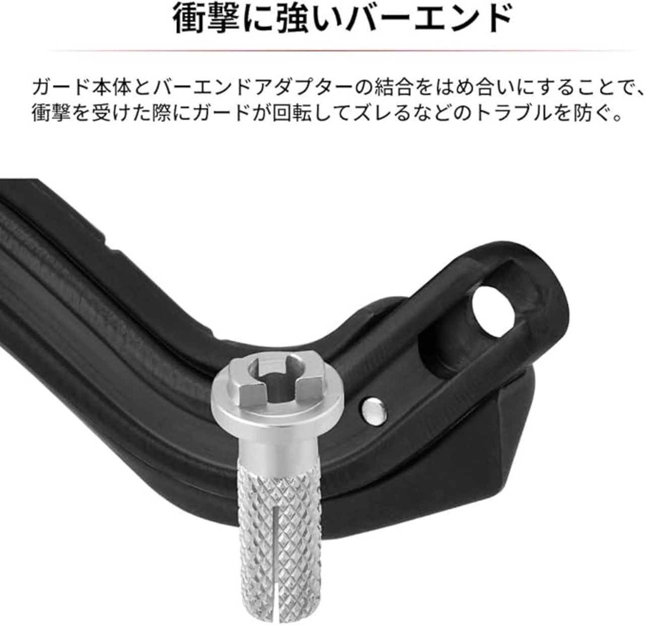 ガード本体とバーエンドアダプターの結合をはめ合いにすることで、衝撃を受けた際にガードが回転してズレるなどのトラブルを防ぐ。