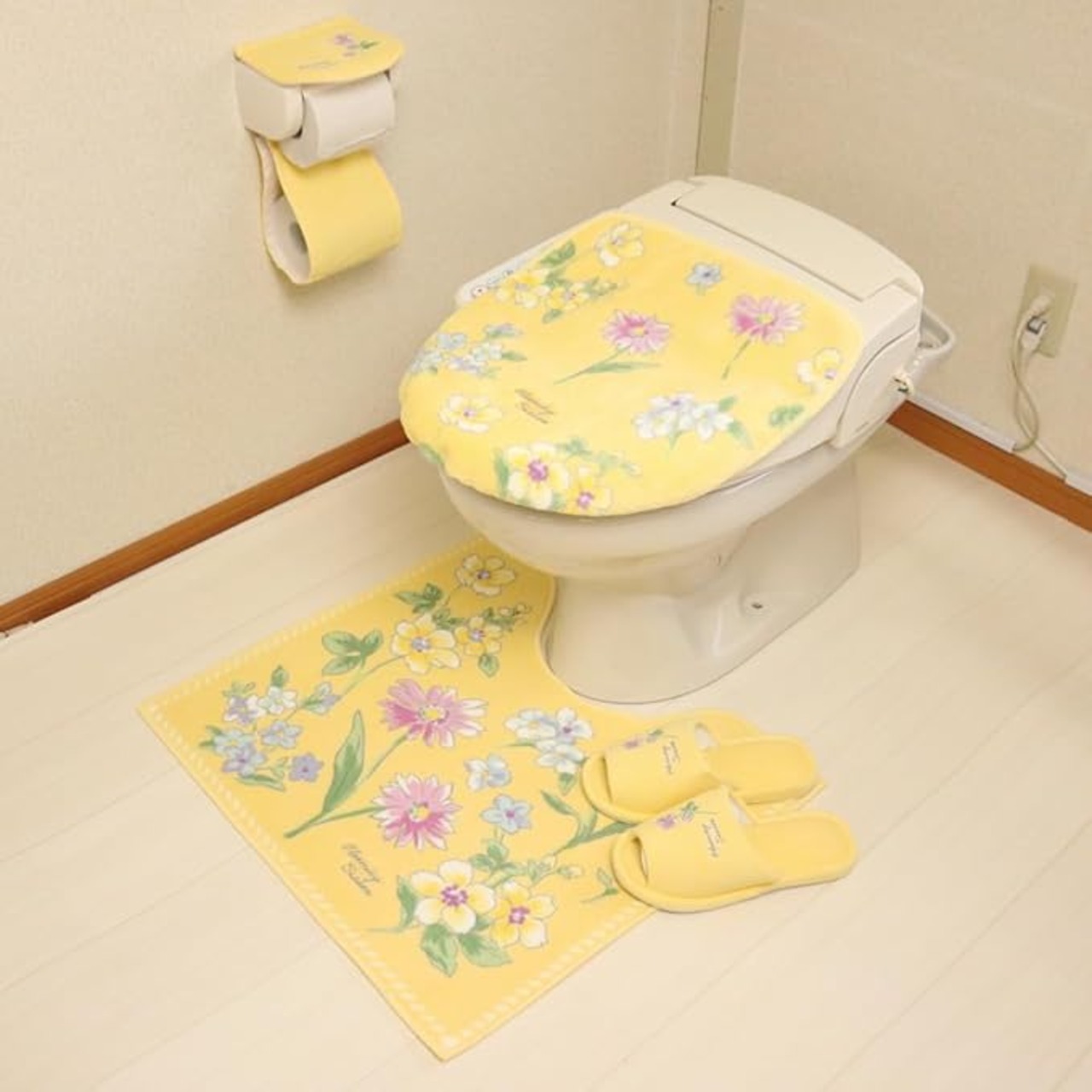 植物をモチーフにしたボタニカル柄がトイレタリーになりました。 トレンドの2つでもあり、好きな人が多いボタニカル柄です。 花柄でありながら甘くなりすぎな、ナチュラルでクリーンなデザインです。 ●吸着タイプです。 ●トイレマットの裏側には滑り止め加工がされております。 ●丸洗いができるのでいつも清潔です。 ※オカ ブルーミングシーズン ※カラーはイエローとブルーよりお選びください。 ※セット 1:共用ふたカバー  2:トイレマット(約55cm 60cm ) 3: ペーパーホルダーカバー  4:スリッパ ※商品詳細 トイレマット:サイズ:約55cm 60cm(首下 約42cm) 品質:アクリル100%(吸水加工)抗菌防臭加工 裏面すべり止め加工 生産国:日本 重量:305グラム パイル高さ ショートパイル ペーパーホルダーカバー: サイズ:約340mm 170mm 20mm 品質:綿75% ポリエステル25% 成型部品 ポリプロピレン 生産国:中国 重量:53グラム スリッパ:足のサイズ:約23cm~25cm 品質:綿75%・ポリエステル25% 生産国:中国 重量:175グラム ※ふたカバー適合 ●適合します:40~46cm ●奥までかかりませんが装着可能:47~52cm (フタ長さ+前部厚) ※自動開閉機能付きのトイレでは自動開閉機能はお使いになれません。 ※ペーパーホルダーカバーは、上下連結フックが差し込めないタイプのペーパーホルダーには使えません。 ・お使いのモニターの設定により、色の見え方が異なることがございます。ご了承ください。 ※当商品は衛生商品ですので、返品をお請けできません。 ※ 【お洗濯をする場合のご注意点】 ・乾燥機はご使用にならないで下さい。(熱により変形・損傷の恐れがあります) ・柔軟剤や漂白剤はご使用にならないで下さい。 ・ドラム式などの一部の形式の洗濯機はご使用できない場合があります。 洗濯機の取扱説明書をよくご確認の上、洗濯して下さい。 ・家庭用洗剤をご使用の上、洗濯機での丸洗いは洗濯ネットをご使用下さい。 ・初めは多少毛が抜けますので、他の物とは別にして下さい。 ・この製品に使用しているゴムは直射日光に弱い性質があります。 必ず陰干しにしてください。