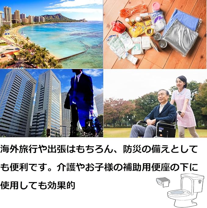 用途は海外旅行や出張はもちろん、災害時や防災の備えとしても便利です。防水仕様ですので、介護やお子様の補助用便座の下に使用しても効果的です。