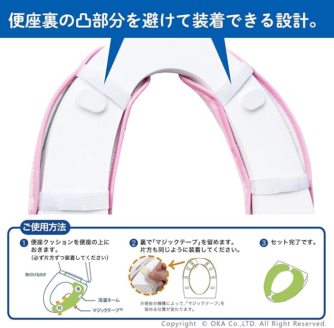 「マジックテープ」で簡単・しっかり止まる便座クッションです。