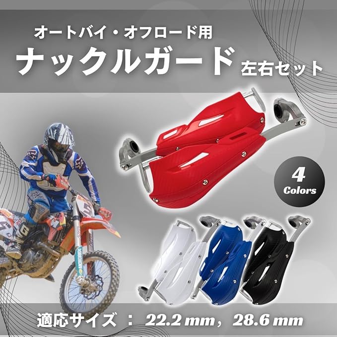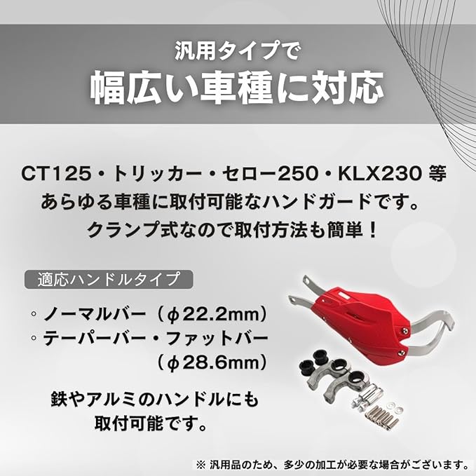 【汎用デザイン】シンプルでちょうどいいサイズ感で、ヤマハ・スズキなどのオートバイはもちろん、オフロード 7/8" 22.2mm と 11/8" 28.6mmのハンドルにも適用する汎用性のあるナックルハンドガードです。CT125、トリッカー、セロー250、KLX230、ネイキッド、スポーツ、アメリカン、カフェレーサー、クラシック、旧車、スクーターなど、様々な車種のバイクにご利用いただけます。※購入前に必ずご利用車種や本製品サイズ等をご確認の上、ご自身のバイクに装着可能かどうかをご確認ください。車種によっては取り付け時に加工が必要な場合もございます。説明書の添付や取付サポートはございませんので予めご了承くださいませ。