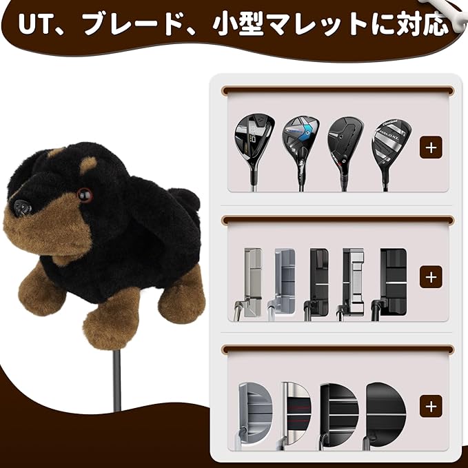 ダックスのぬいぐるみのような見た目が可愛い、ゴルフがもっと楽しくなります。