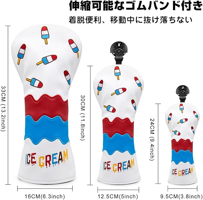 ゴルフクラブヘッドカバー 三色アイスクリーム サンプルデザイン ゴルフヘッドカバー 高級レザー製 ウッドカバー ドライバー フェアウェイウッド ユーティリティ ハイブリッド用ヘッドカバー 番号タグ付き
