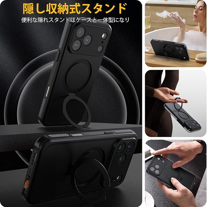 【スタンド機能・MagSafe対応】便利な隠れスタンドはケースと一体型になり、絶妙なデザインで携帯を自由に多角度を調節でき、力よくスマホを支えて、映像や読書などに楽しめることができます。強力なN52マグネットを搭載しており、マグセーフ充電器やその他様々なマグセーフマグネットアクセサリーをしっかりと保持します。また、急速充電可能です、マグセーフアクセサリーとの完全な互換性があり、安心してお使いいただけます。